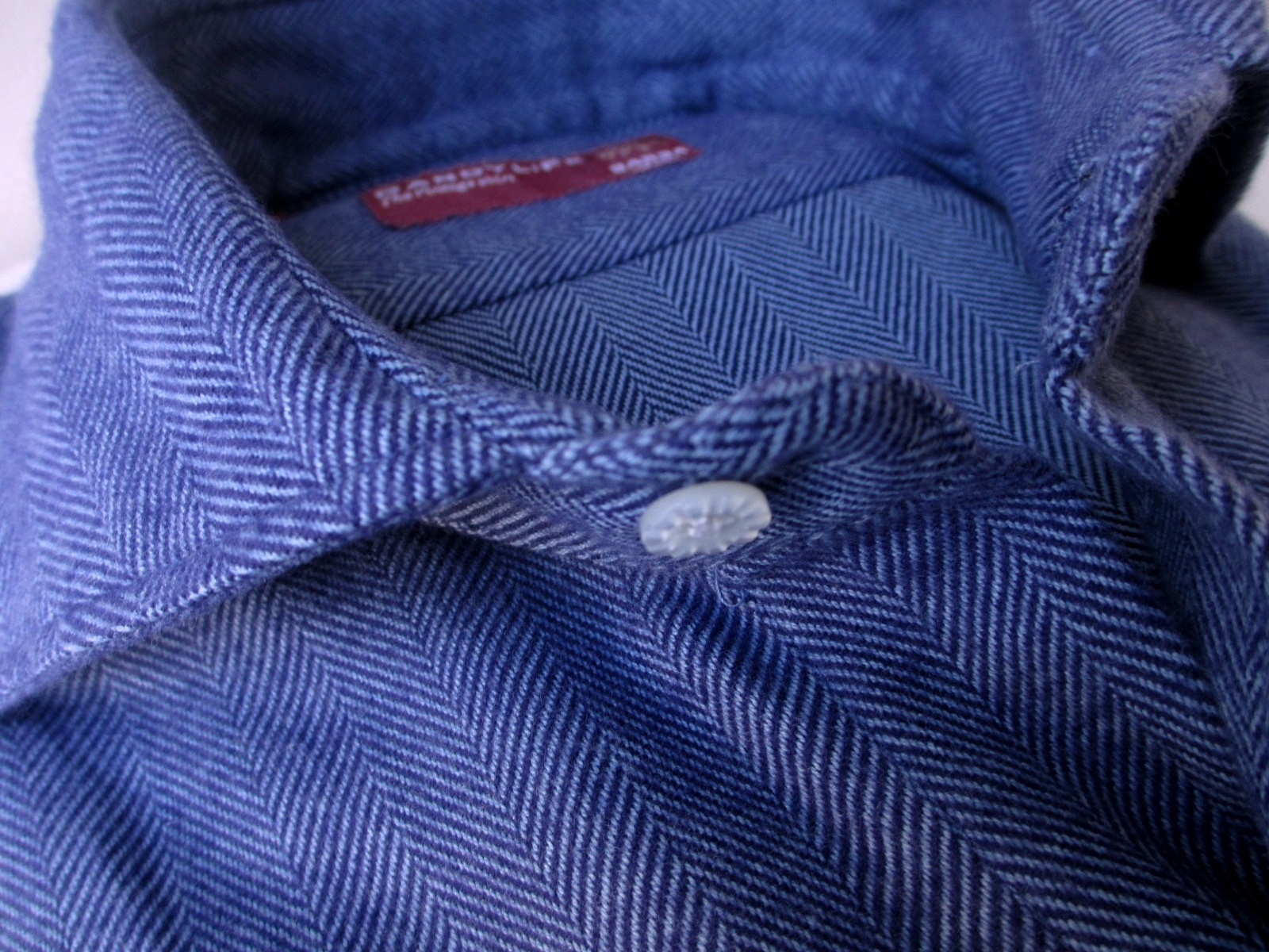 ヘリンボーン柄は襟元の表情を作り、濃いめのブルーが全体を引き締めます。ミドルゲージからローゲージのニットにお勧めです。もちろん、ジャケットのインでも活躍してくれるシャツになりそうですね。
