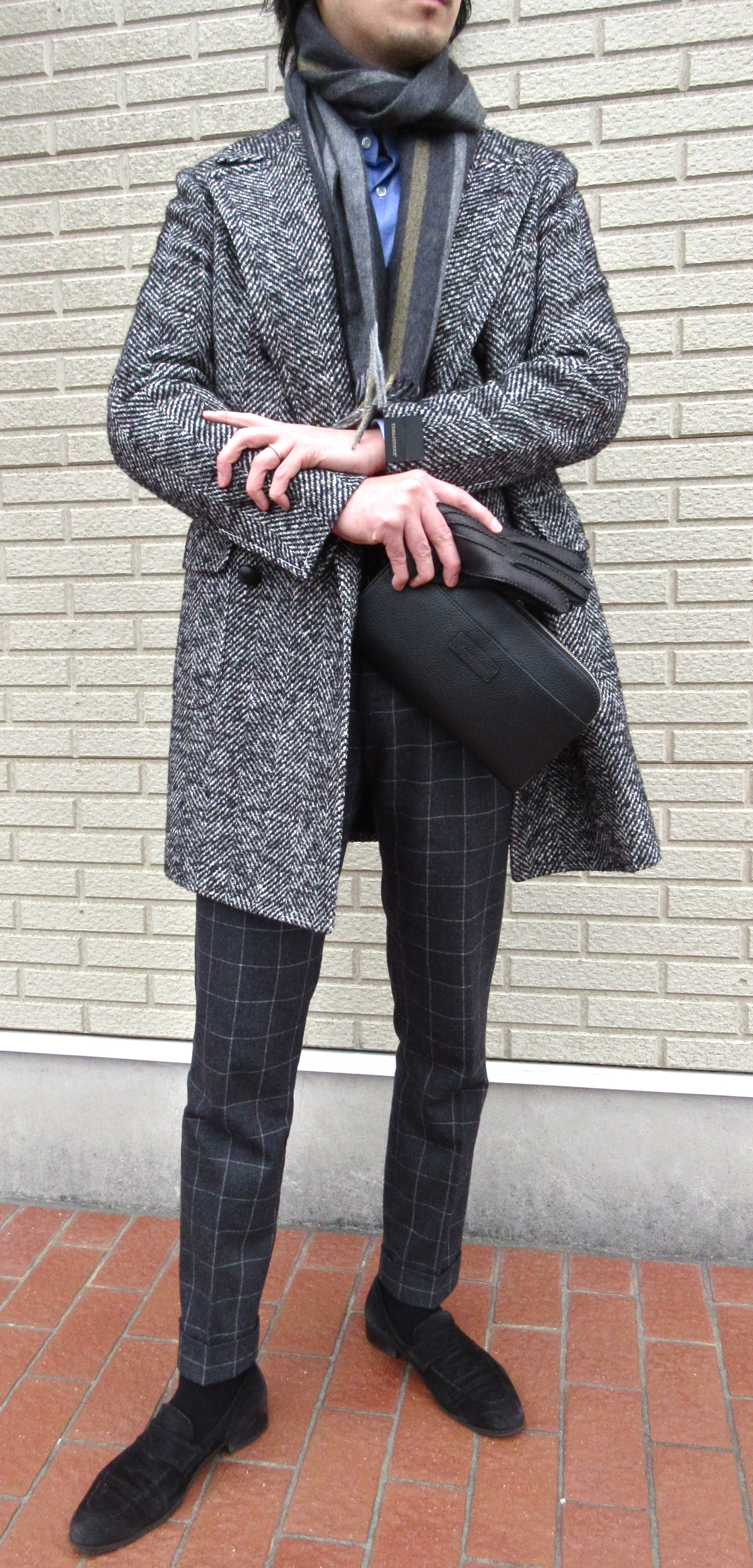 ネイビーベースに合わせたアウターはTHE GIGI、ジャケットもTHE GIGI、パンツはJACOB COHEN、バッグはCISEI、シューズはFERRANTEです。チャコールグレイベースに合わせたアウターはTAGLIATORE、パンツはBERWICH、バッグはZANELLATO。ブラウンベースに合わせたアウターはSealup、バッグはCISEIです。