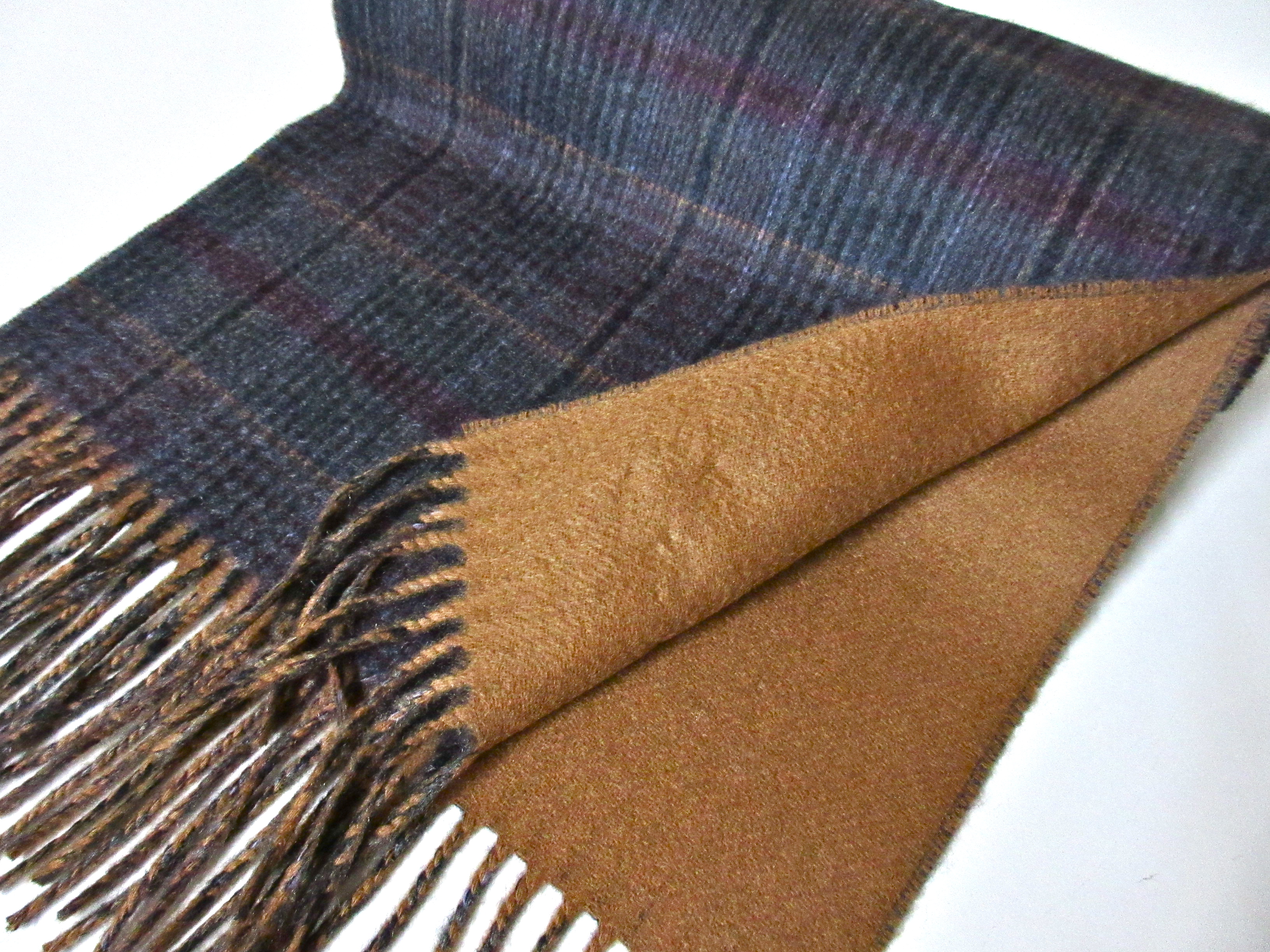 左は、グレイをベースに、ヘザー(Heather)というツツジ科の花に見られる赤紫色を配したグレンチェックと、鮮やかなキャメルの組み合わせ。右は、ブラウンとベージュに、ロイヤルブルーのラインを走らせたチェックと、裏面もロイヤルブルーの組み合わせです。