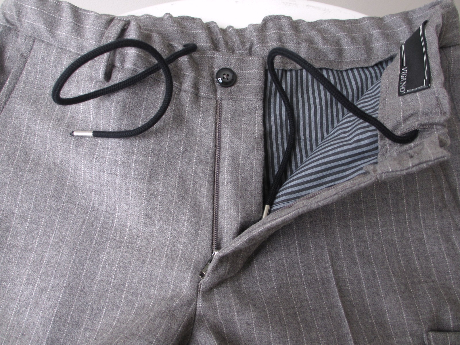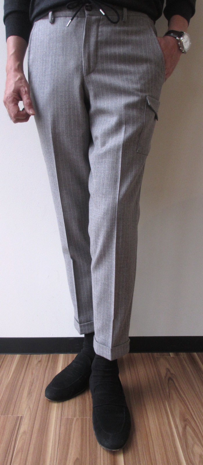 ループ・ドローコード付きのノータック仕様です。ライトグレイのストライプ柄パンツは、ストレッチの効いたサキソニーウール。デザインと素材の素敵なハーモニーを楽しんでください。
