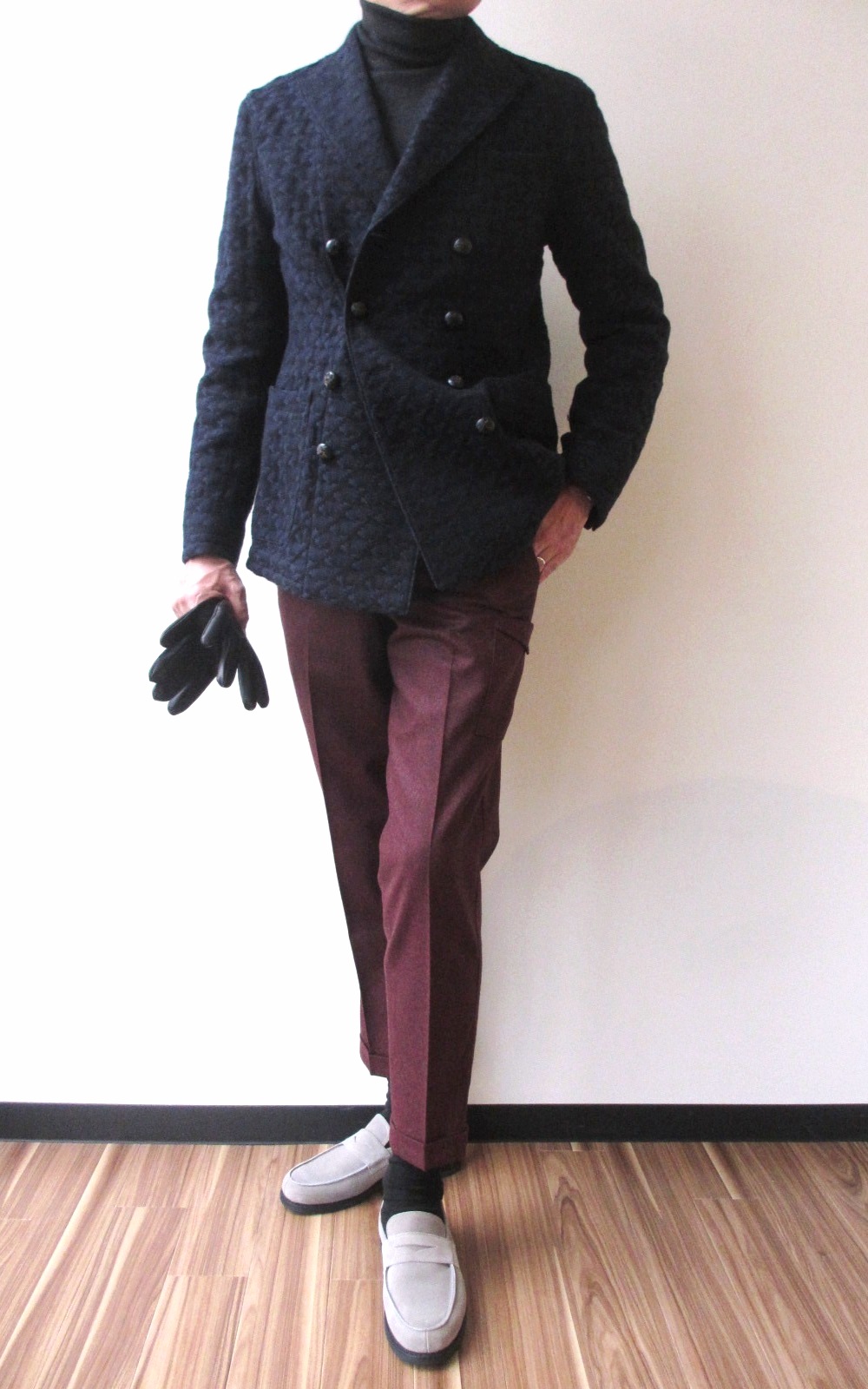 存在感のあるTHE GIGIのジャケットには、インパクトのあるボルドーのパンツを。モデルは、ライトグレイのストライプ柄と同じ「CL8I」でセレクトです。あわせたニットはZANONE、グローブはDENTS、靴はParabootです。