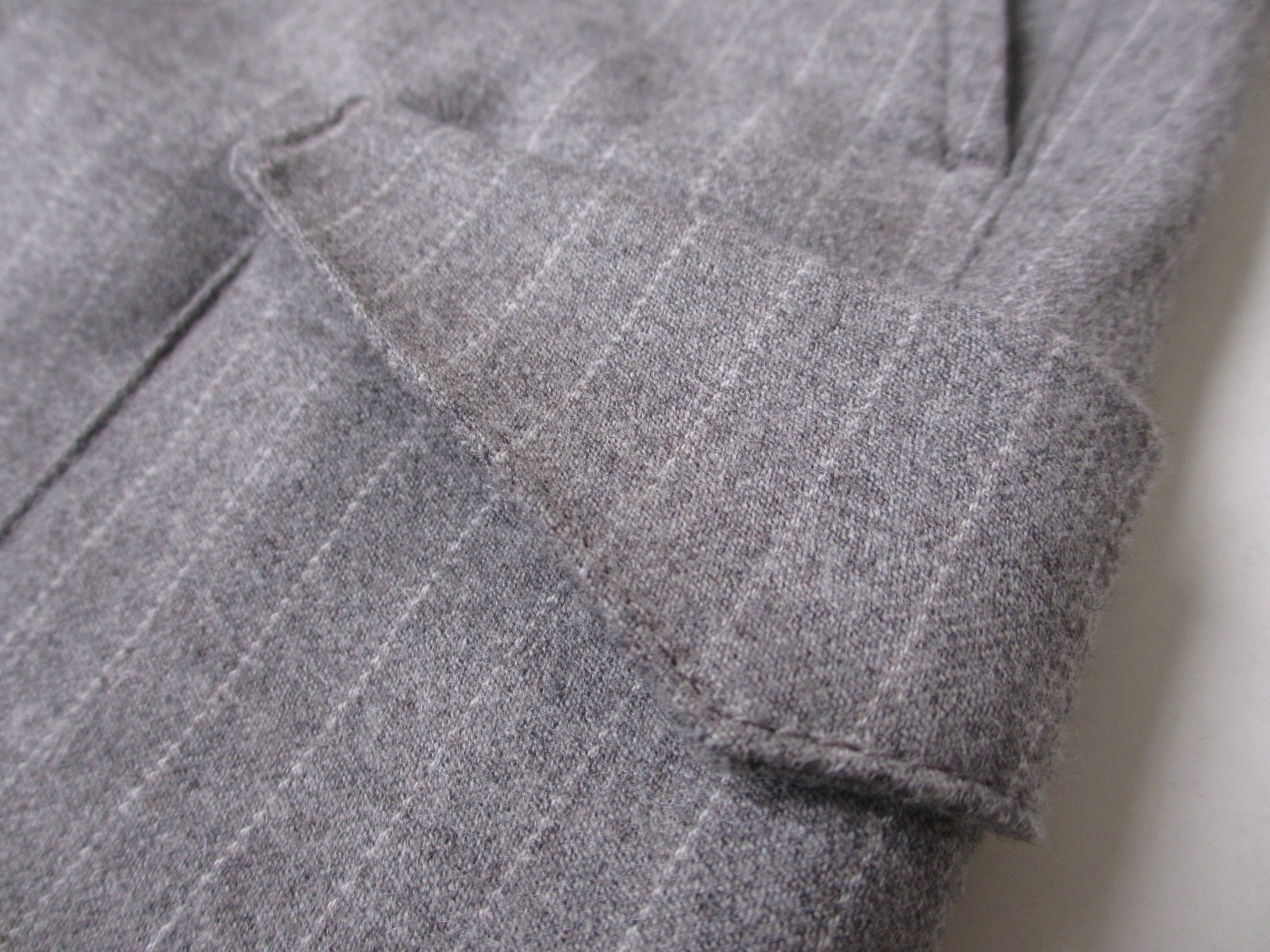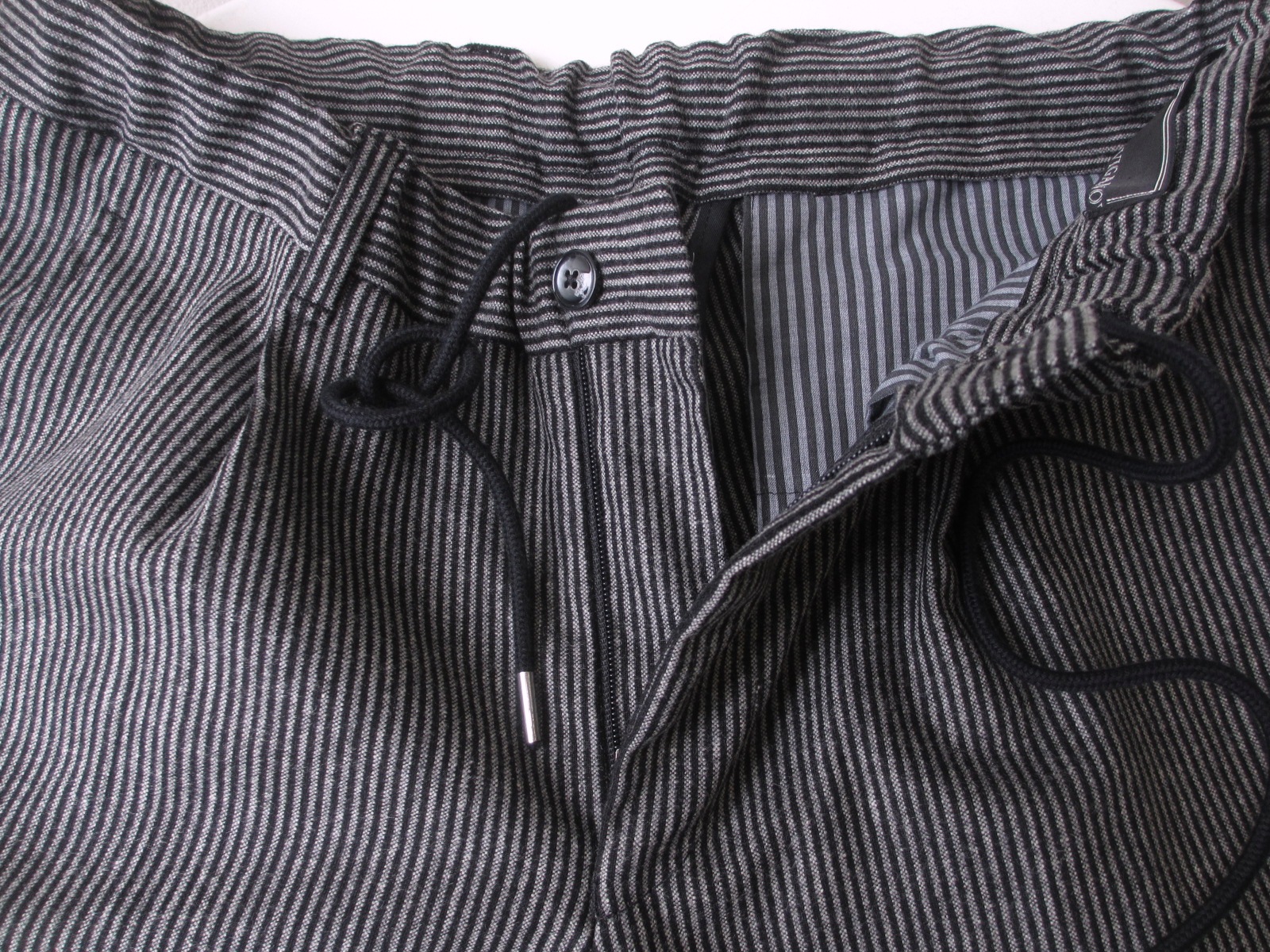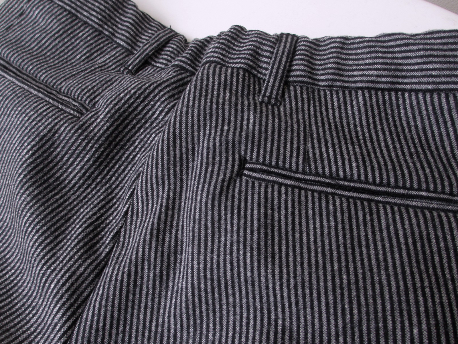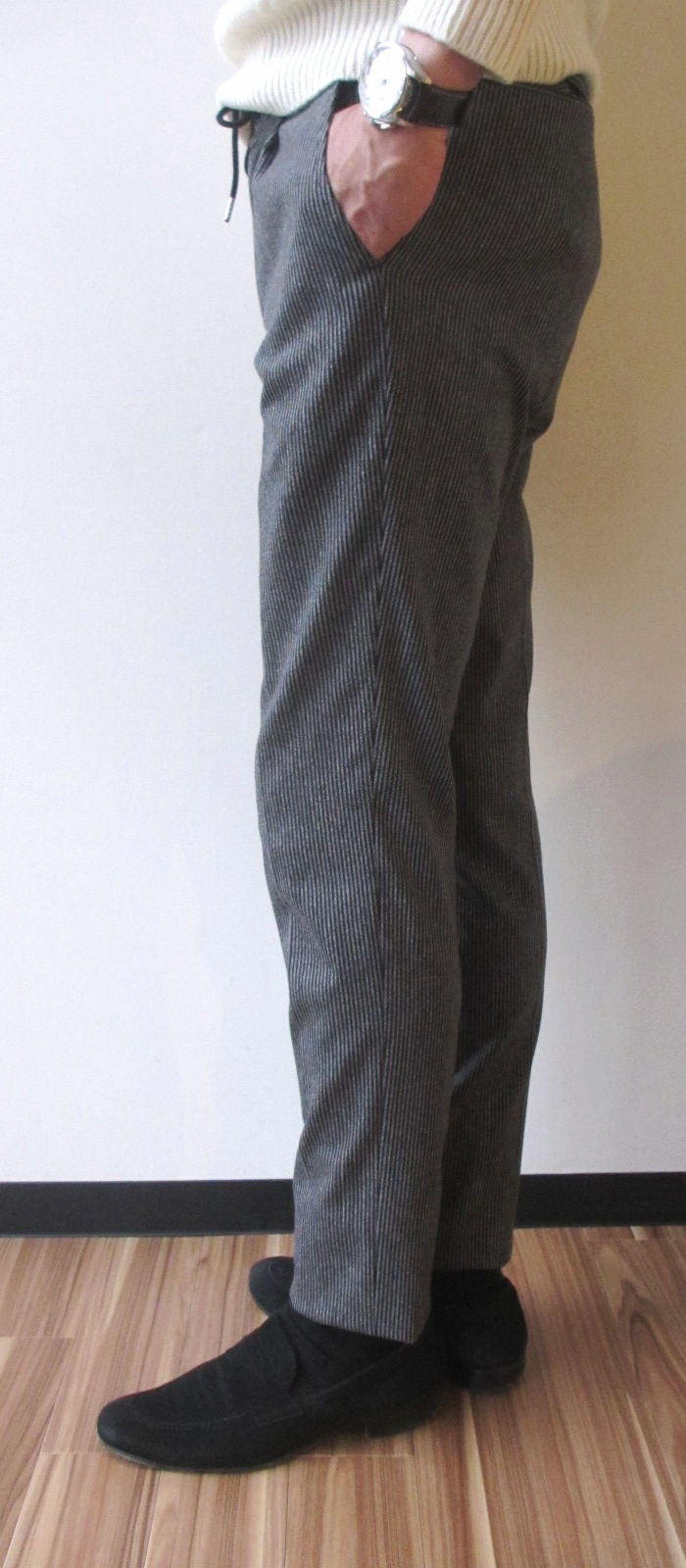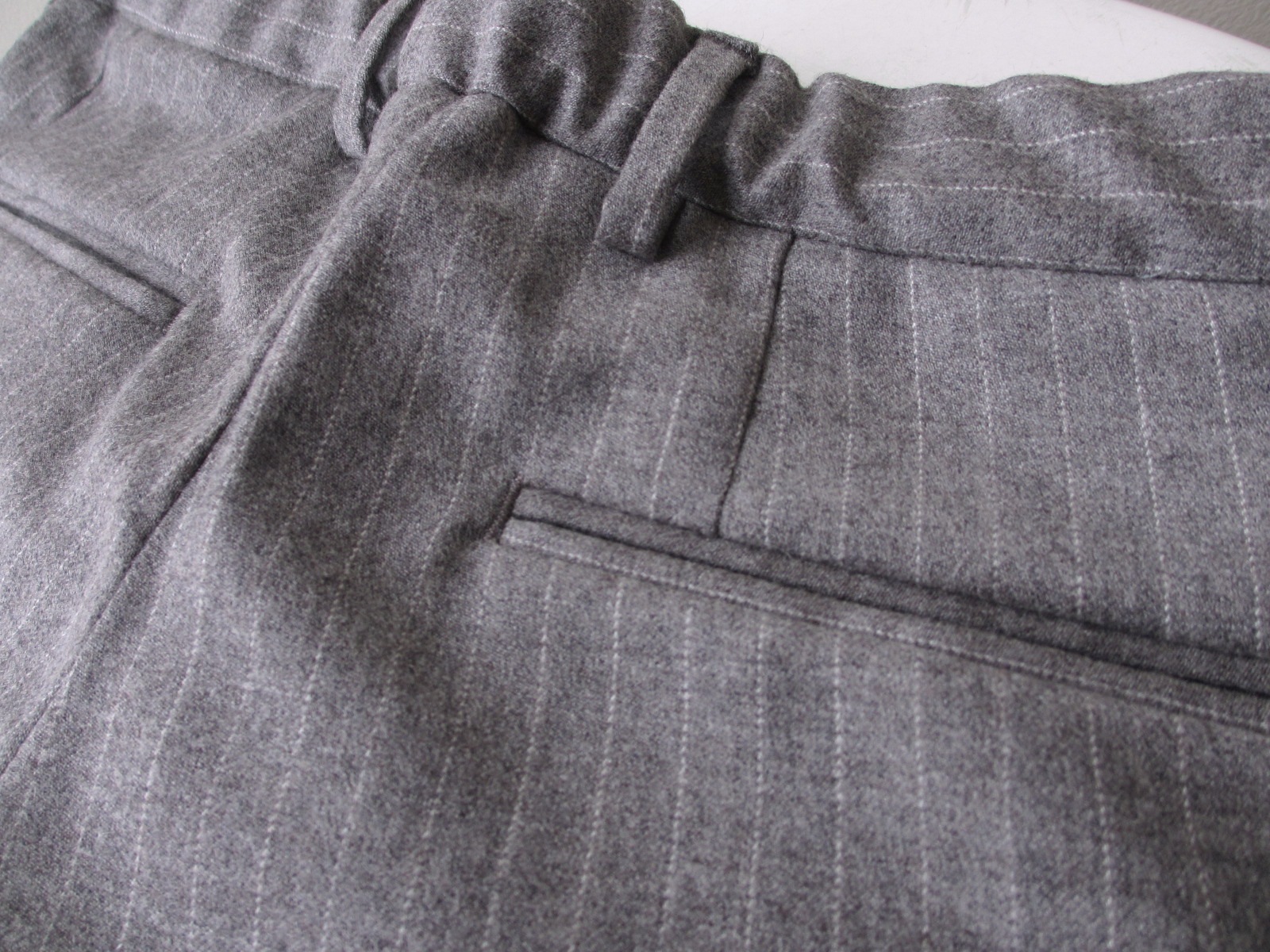 礼装用モーニングに似たコードストライプ柄。ウール・ナイロンストレッチのループ・ドローコード付きの1タック シャーリングパンツ。展示会で、ウエストのフィット感を若干緩めてくれるようにリクエスト。ウエストの収まりは、ずいぶん改良され、より心地よいパンツに仕上がりました。