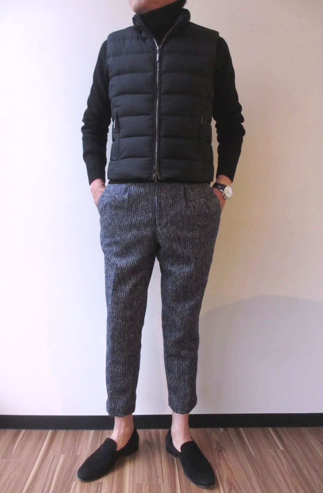 そして、タカイコーデが、こちらのMooRERのダウンベスト(私物)を使ってのコーディネートです。ニットは同じZANONE、靴は私物のFERRANTEです。![]()