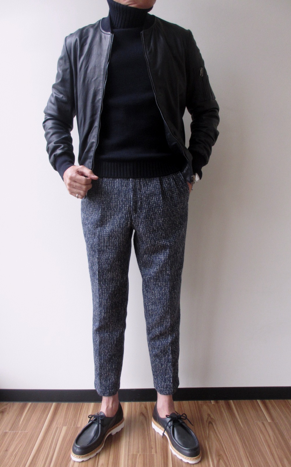 急遽、コーディネートの変更です。【VIGANO/ヴィガーノ】のパンツは昨日が撮影日。ただ雨の日の夕暮れは早く、色が上手く出ません。ということで、本日、撮影のやり直し。でも、本日も雨。あまり変わらないような気がします。合わせたのが、RadiceのレザーにZANONEのニット。足元はParaboot(紐をスペアの黒に変えています)を履いています。
