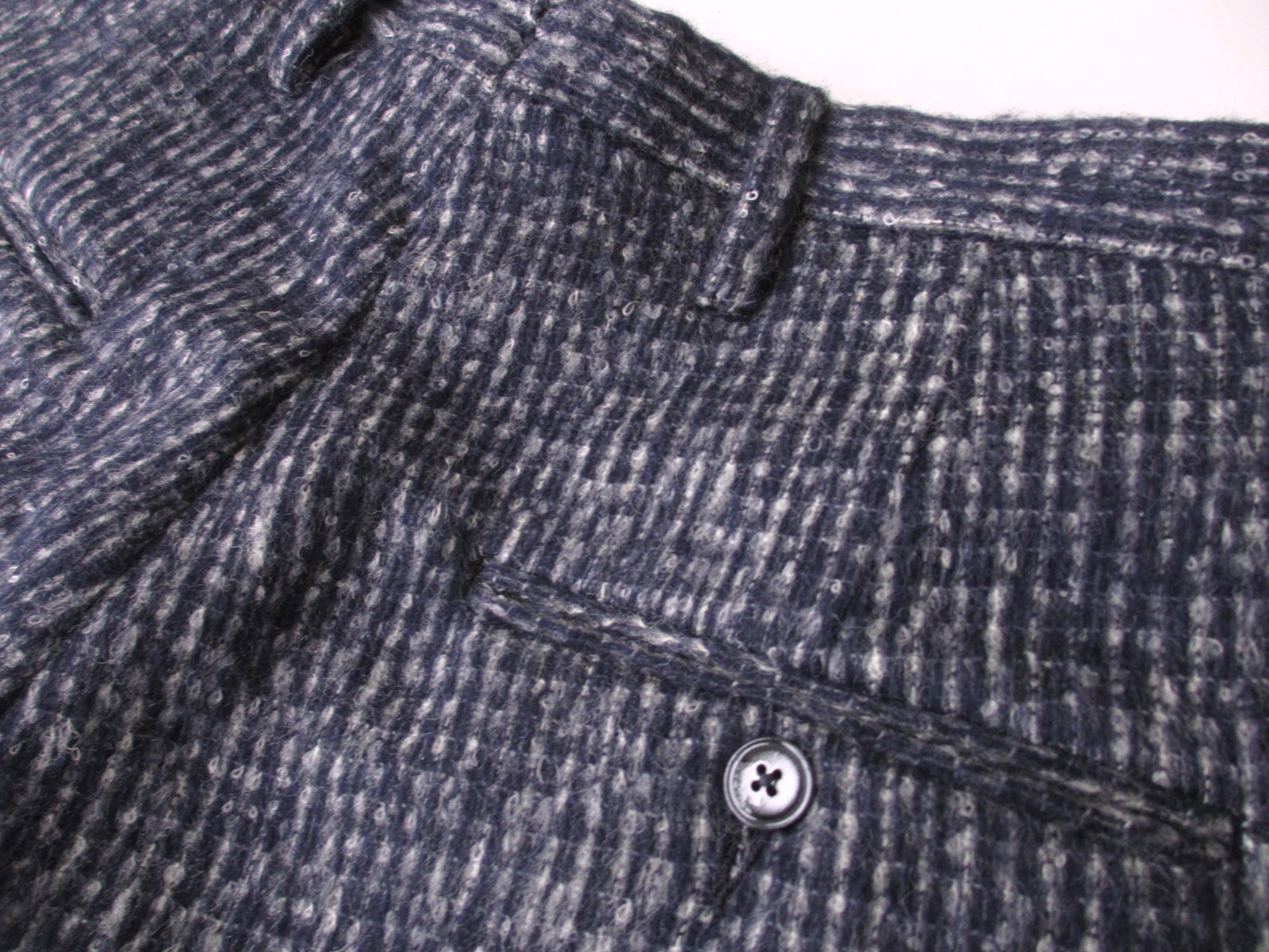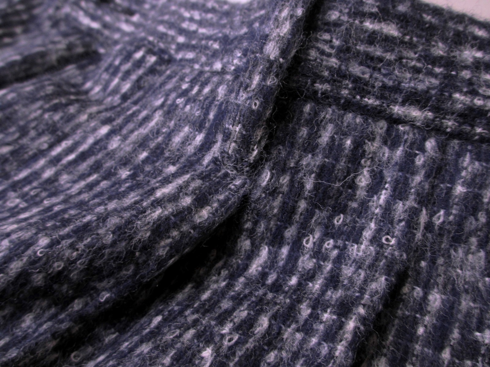 ウール・ナイロンのブークレは、リズミカルな表情です。ネイビーベースにホワイトとライトグレイの糸が優しいメロディーを奏でてくれる、穿き心地のよいパンツに仕上がりました。