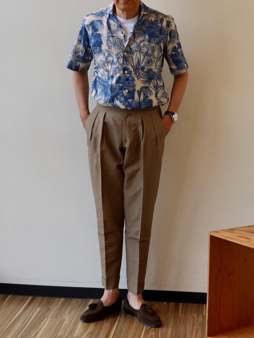 合わせたアロハシャツ(BAGUTTA)をタックアウトして気楽に穿くこともできますが、インをしてウエストラインを見せれば、プリーツから裾にかけての美しいラインが歩く姿をエレガントに。すれ違う女性が必ずや振り向いてしまう...ことを期待したくなるモデルが「SCOTCH」なんです。