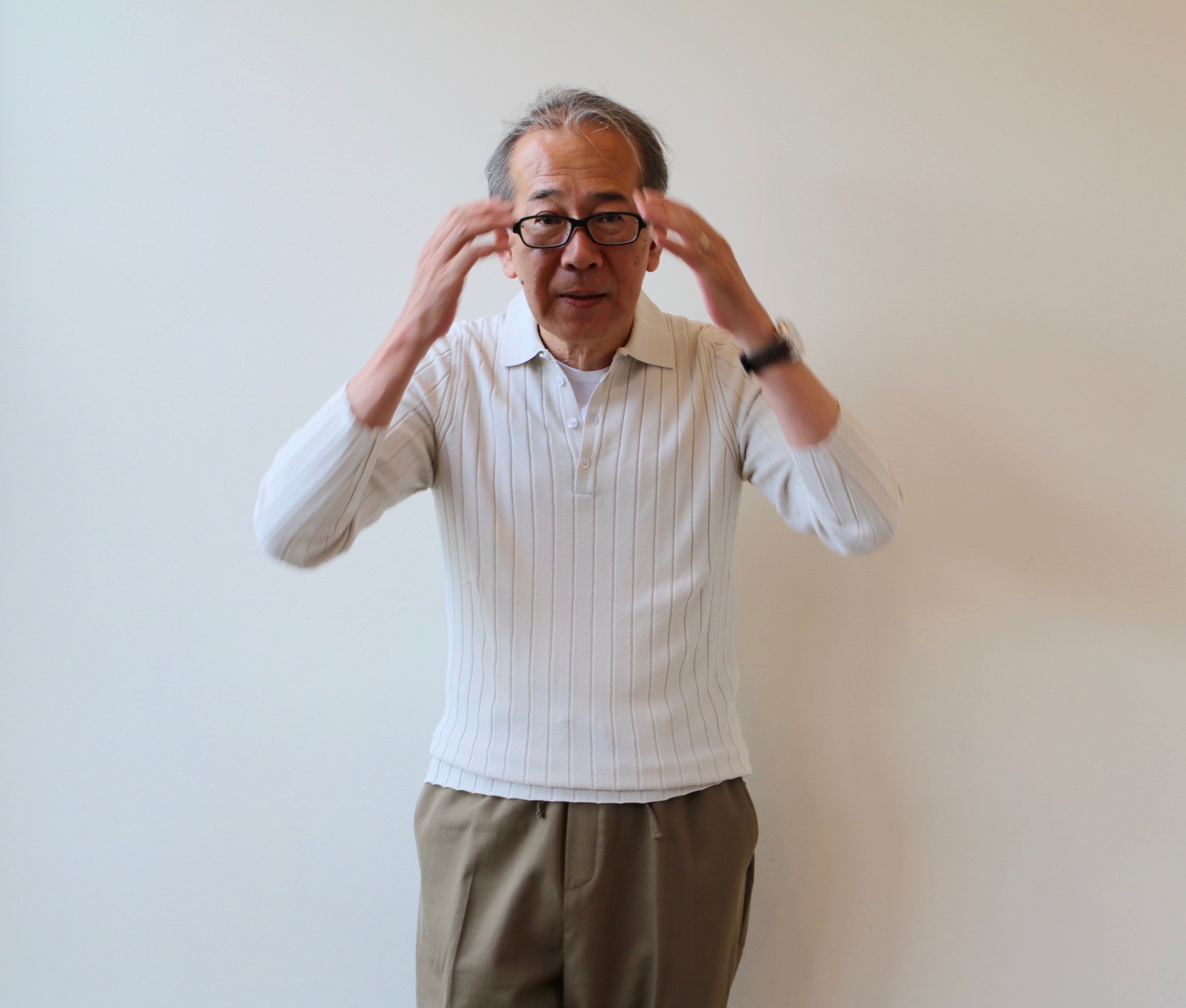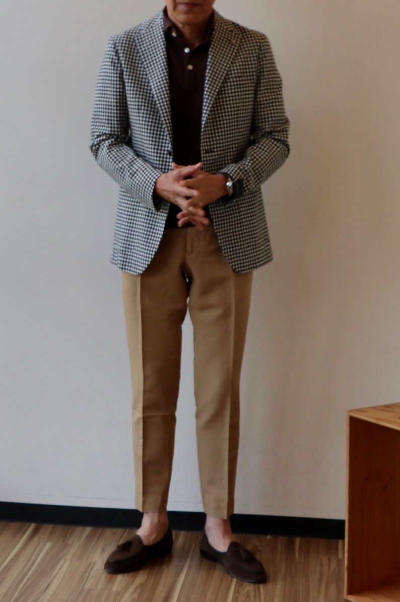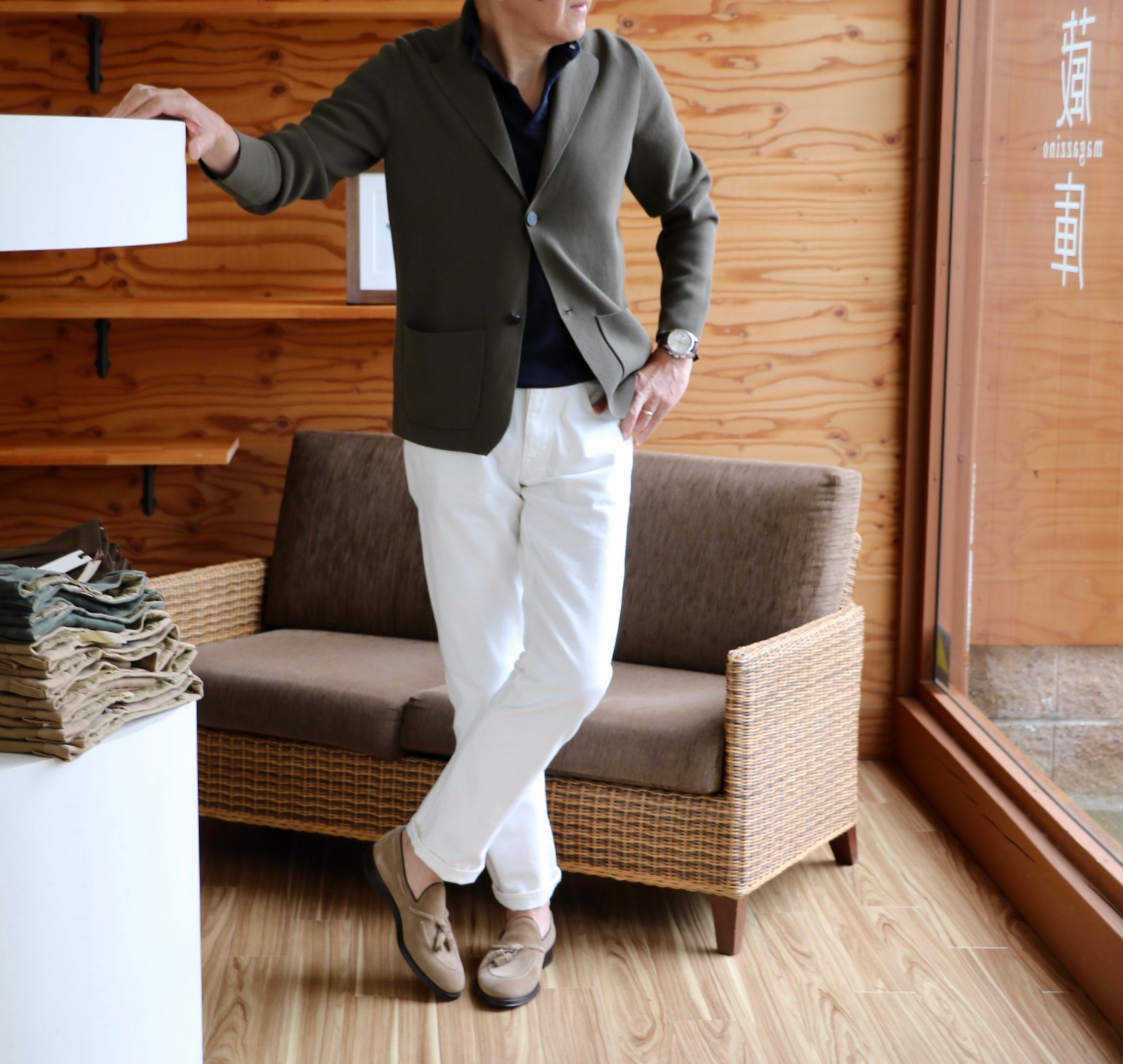 台襟付きのポロシャツ(FEDELI)にジャケット(TAGLIATORE)を羽織っての登場は、【INCOTEX/インコテックス】の「LOW RISE CARROT FIT」CHINOLINOパンツ。インコテックスを代表するクリーンな夏素材。すっきりフォルムと包みこまれる穿き心地に、控えめな存在でありながら、年々ファンを増やしています。