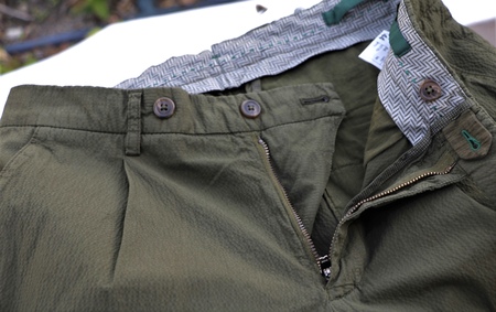 今回の動画で取り扱ったBERWICH(ベルウィッチ)「SAKE」のシアサッカーパンツ。ベージュの他にオリーブグリーンもご用意しております。