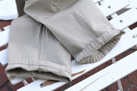 ベージュの他にホワイトもご用意しております。立体的なウネが斜めにクッキリと表れるカルゼ。英国の織物都市、Kerseyで織られたことが由来。シアサッカー のように凹凸感があり、エアリーな生地感と柔らかな肌触りが魅力です。大人のリラックスウエアとして必要なのは、上品さと高級感。オヤジがモテるのに必要な条件を満たしたパンツと言えるでしょう。