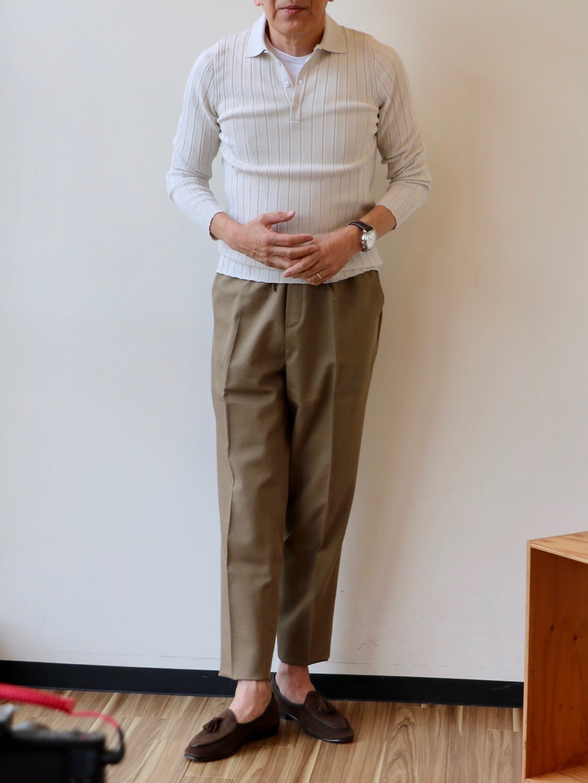 編み地柄のポロニット(PHIL PETTER)との組み合わせがお気に入りのようです。【Borelio/ボレリオ】の「CHAD2」 コットンカルゼ ドローコード付きシャーリングパンツは、入荷のご案内の際にも同じコーディネートでした。