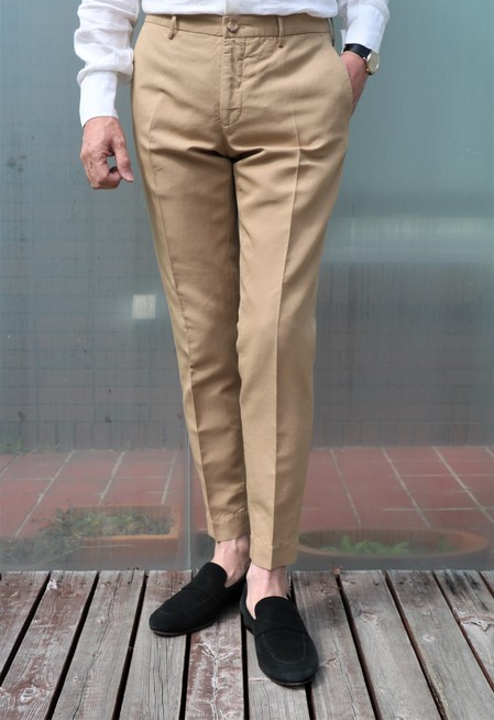 「SAKE」と人気を二分しているのが、インのツープリーツ、サイドアジャスト付きのベルトレスモデルの「SCOTCH」。優雅なシワを持つリネン素材やストライプ、チェックなどのクラシック柄なら、このモデルとの相性は良いはず。