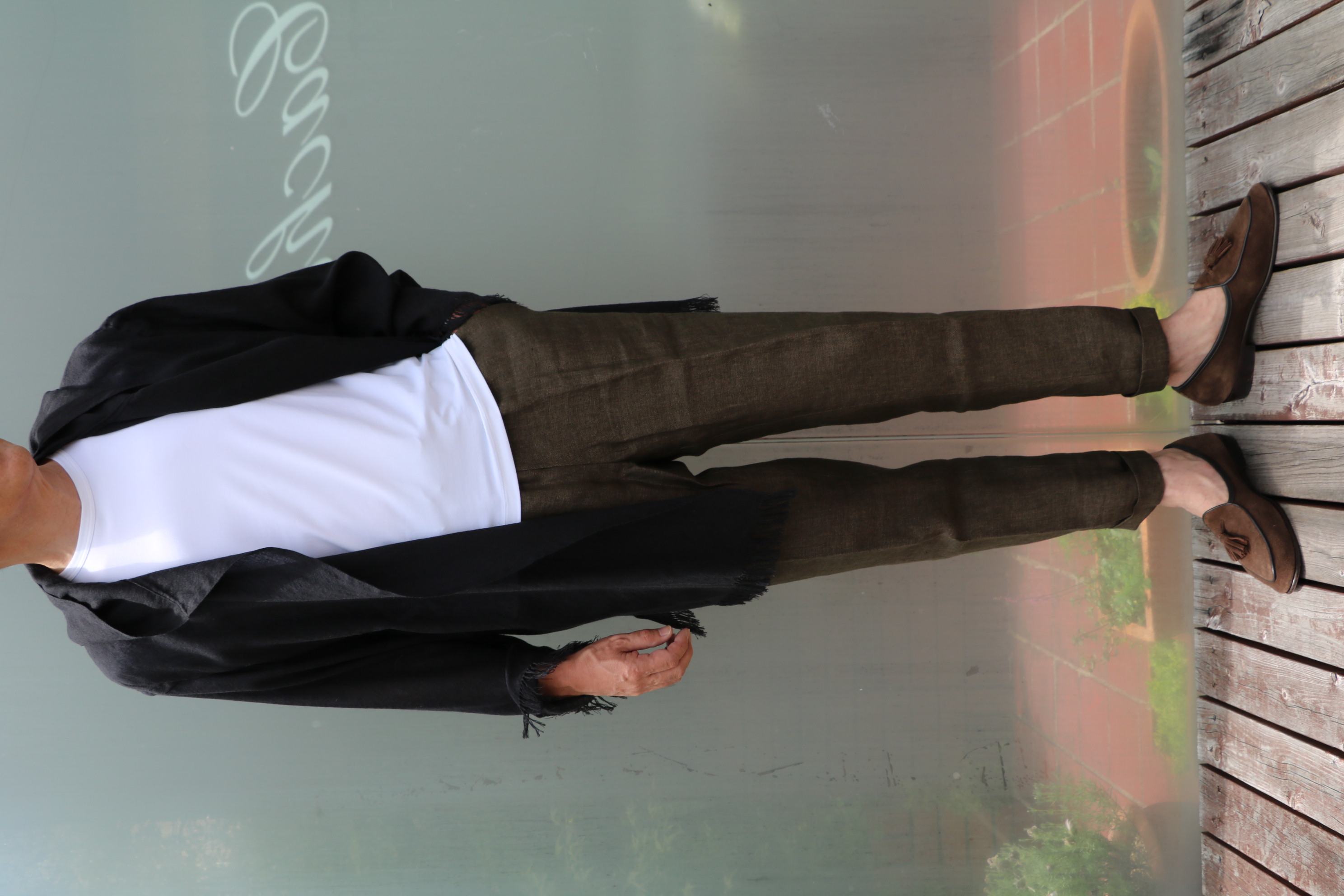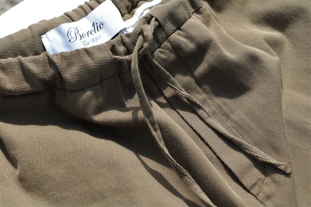 森の中をさらに深く入っていくと、深みのあるダークオリーブに出会えます。ややブラウンがかったオリーブブラウンはリネンの美しい光沢のあるパンツです。ブログを毎回、お読みいただいている方には、もうどこのブランドかお分かりですね。イタリアのパンツファクトリーにはない、ちょっぴりモードな雰囲気を持つ【Borelio/ボレリオ】。