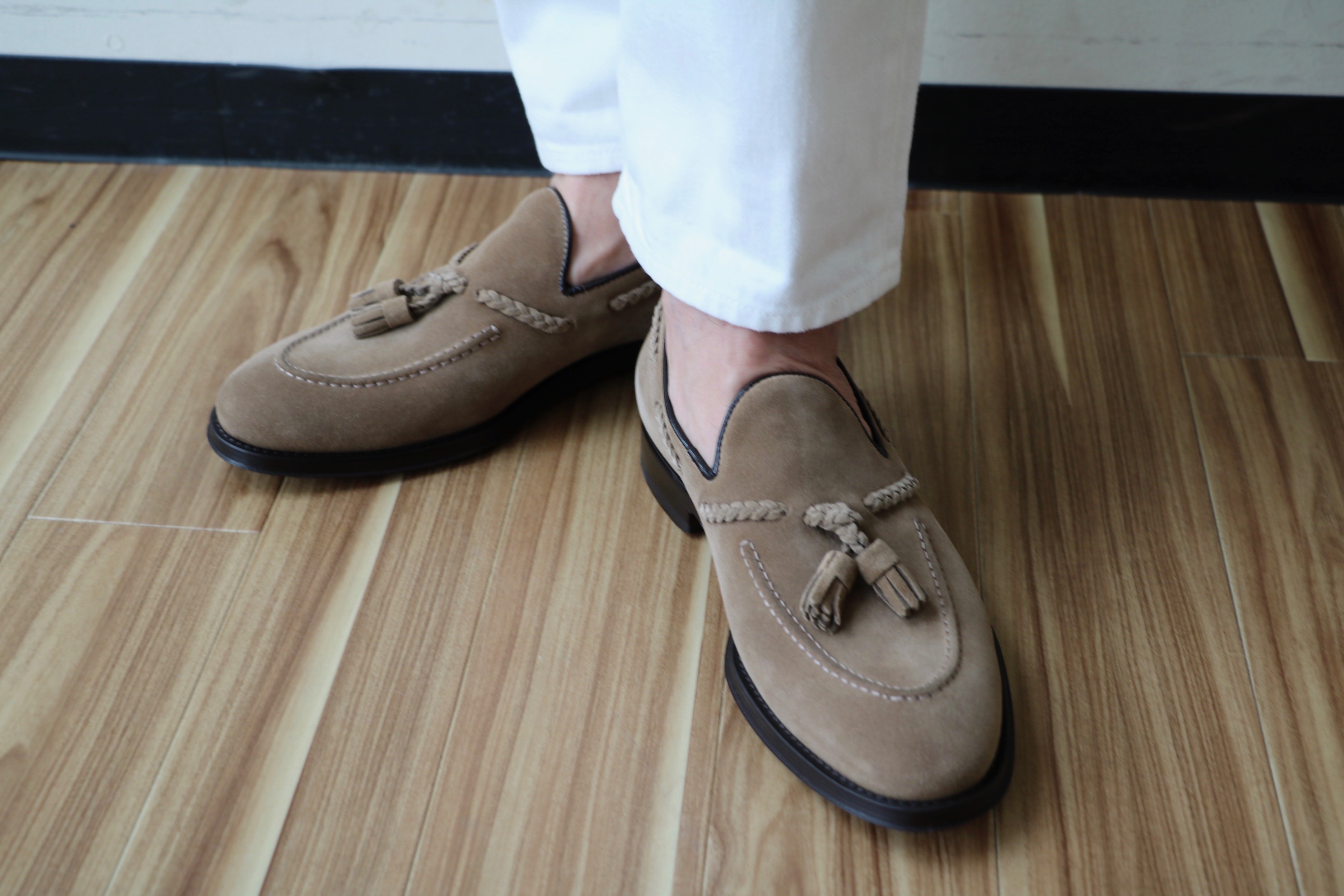 きめの細かいスェードのリボンタッセル。カラーは「DESERTO」。サイズ41。57.000円は本体価格です。