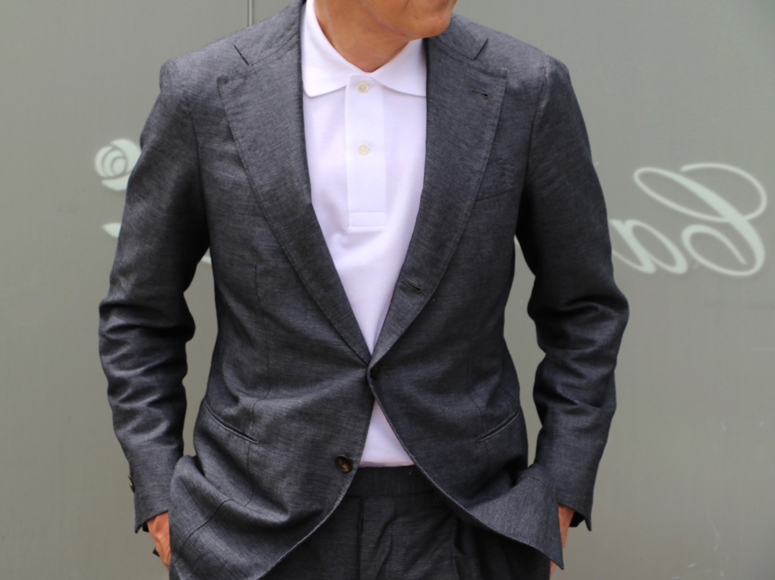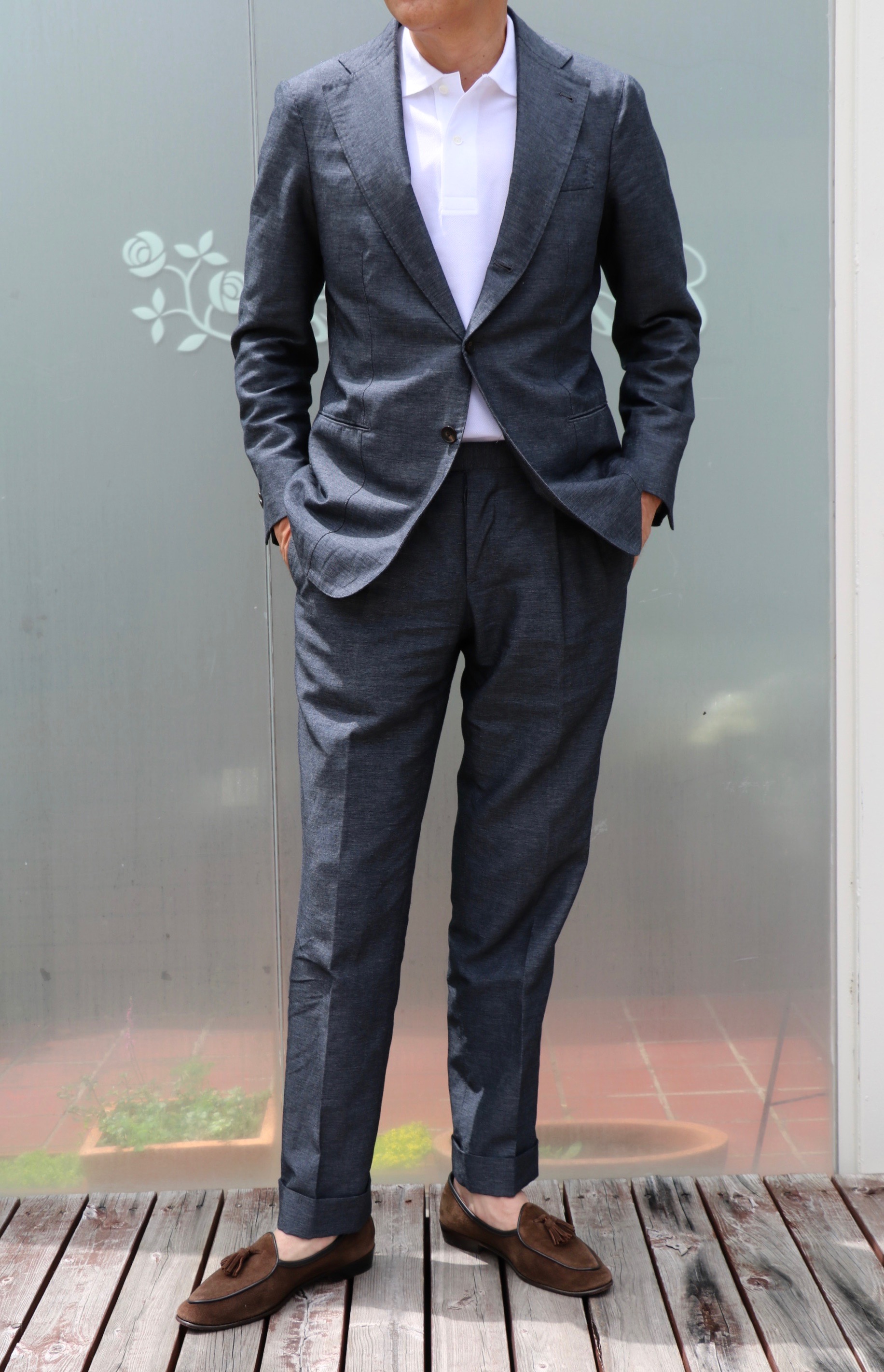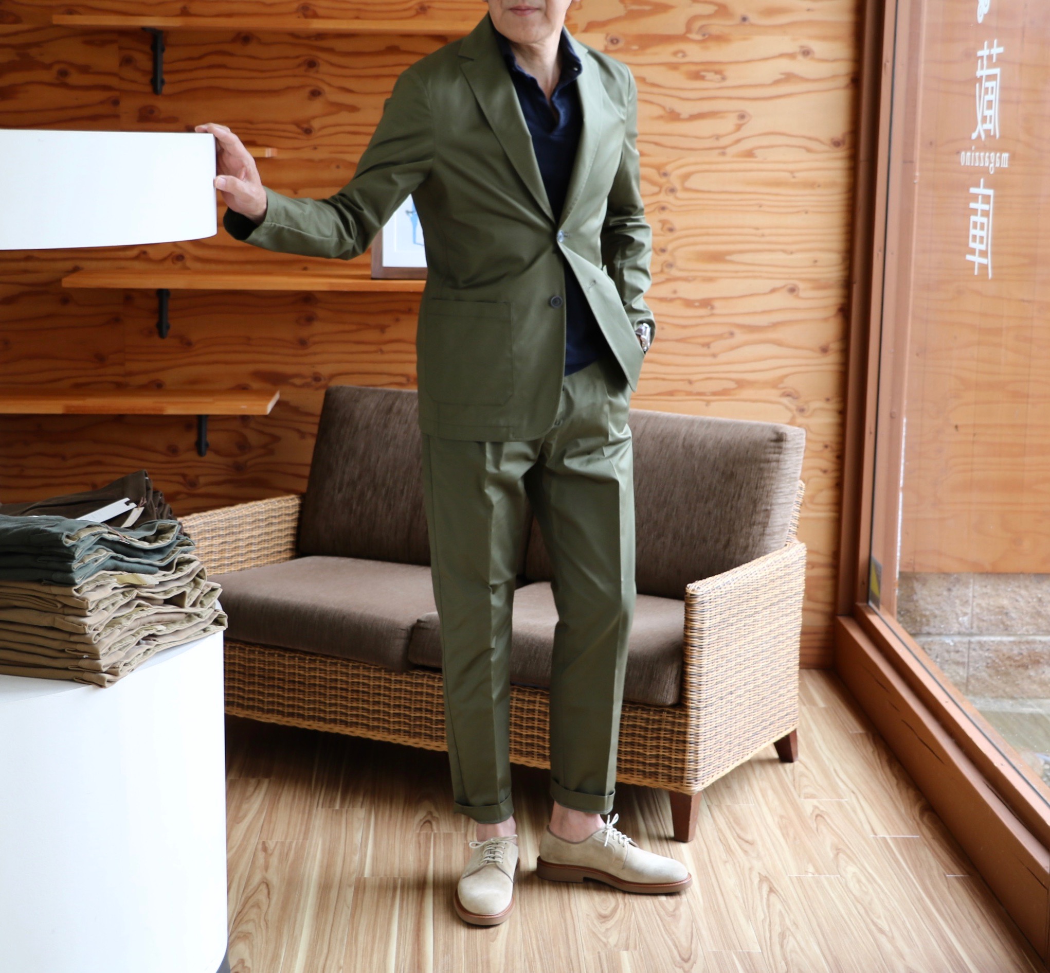 いきなりの写真です。昨日、このスーツを気になされながら、蔵庫/マガジーノ で秋冬物のスーツをご購入されたN様。展示会でも一目惚れしたスモーキーなセージグリーン。思われることは皆さん同じで、残すサイズは48のみ。ちょうどサイズの合うN様にとっては悩ましい選択だったはずです。どこのかと言えば、De Petrillo(デ・ペトリロ)。コットンスーツです。詳しくは、現在、オーダーフェア開催中のMaria Santangelo(マリア・サンタンジェロ)のシャツと共に、こちらのブログでご紹介しております。
