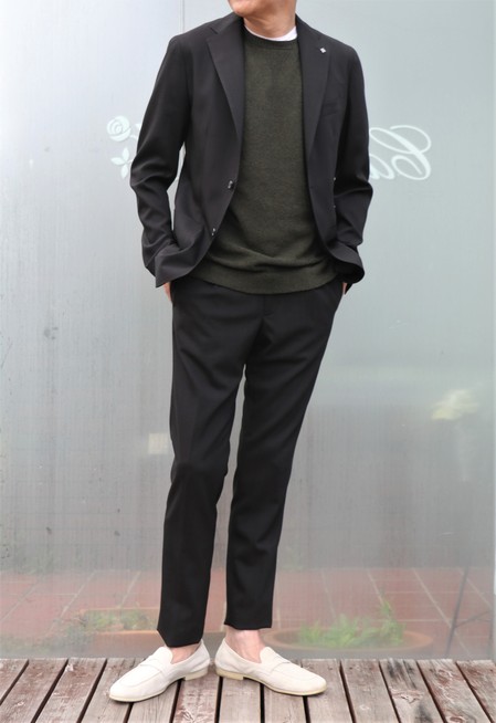 さらにブラックスーツ(TAGLIATORE)に合わせたダークオリーブのニット(ZANONE)。深みにハマりすぎないようにと、襟元と足元にホワイトを差し込んでいます。