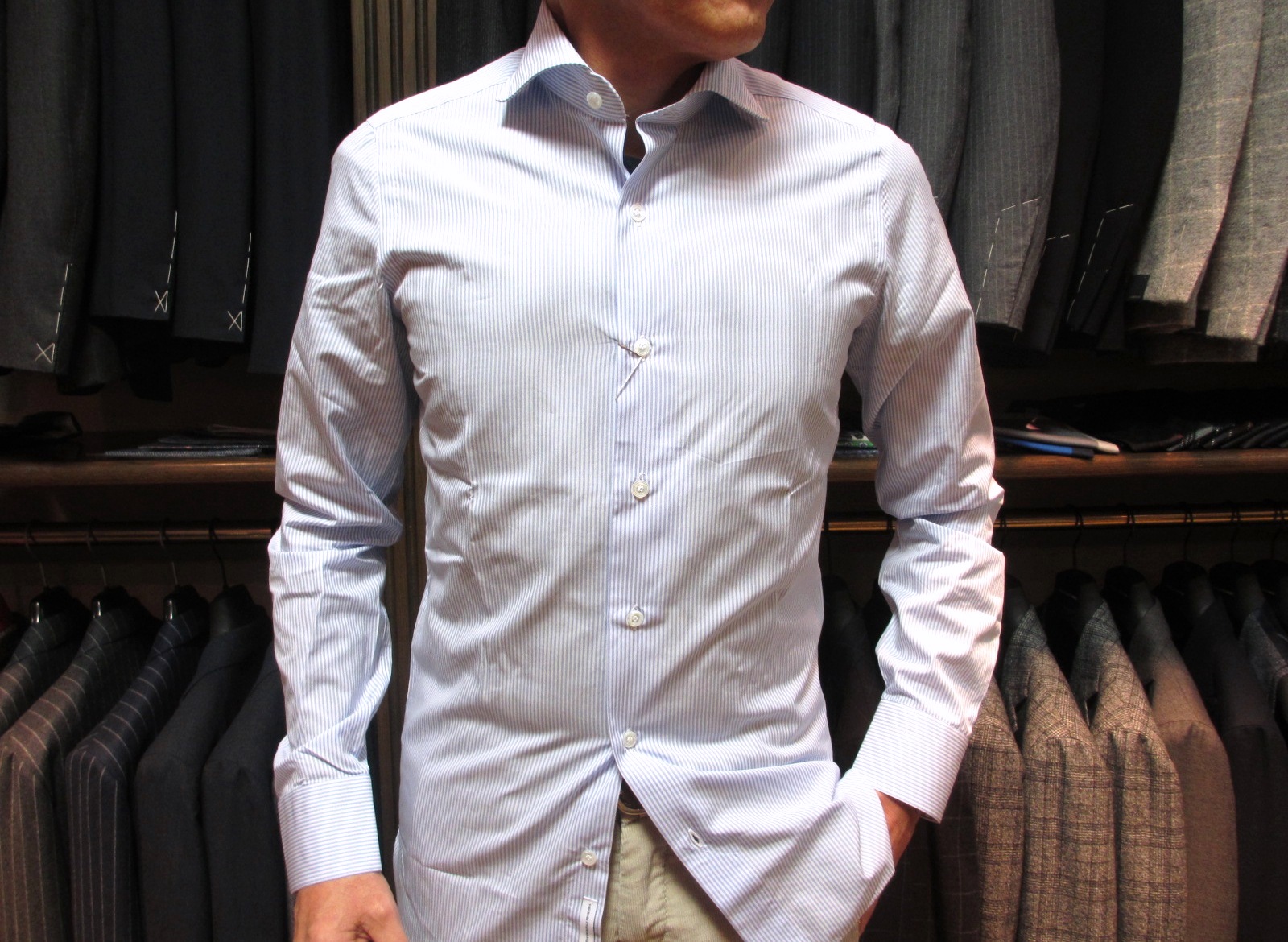 さて、そんな動揺を抑えて、紹介させていただくのは、【Mario Muscariello/マリオ・ムスカリエッロ】。最近の為替の影響で、一旦下がりつつあった価格が急激に上がっています。このシャツも例外ではなく、「3万円を超えてしまうと買いづらいよね」なんて声を良く耳にすると、日本人の体型に合わせたサイズの変更によって、今後、力を入れて行きたい第一候補だっただけに、とても残念でした。前回の展示会では、やはり3万円を切れずに諦めたオーダー。今回も無理かなという気持ちで臨んだ展示会でしたが、なんと朗報が待っていました。生地にもよりますが、なんとか2万台前半で提案できます。ただ、5工程ハンド(ショルダー、アームホール、前立て、ボタン留め、剣ポロのステッチ)ではなく、3工程(アームホール、ボタン留め、剣ボロのステッチ)に手作業部分が減ります。5工程ハンドに拘るか、価格を意識するかと言えば、やはり価格です。若干、肩周りの着心地が硬くなりますが、背に腹はかえられません。でも判断されるのは、皆さんです。まずは、ご覧ください。