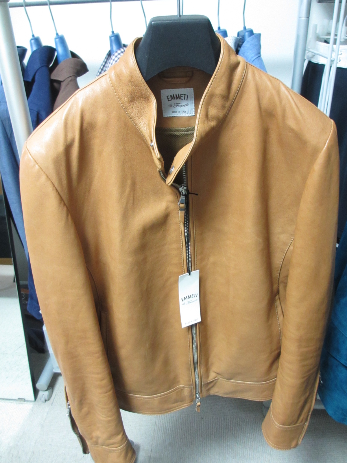 新型モデル「RAFFAELE/ラファエロ」は、胸にジップ付きポケットを配したレザージャケット。ただ、写真はあくまでサンプル。実際は、両方付きます。そして、ジップのシルバー部分が目立つということで、レールをレザーで隠します。サンプル以上に上品な仕上がり入荷です。展開カラーは、写真のブルー(実際はもう少し鮮やか)とブラックの2色。価格は、税込みで122,040円です。
