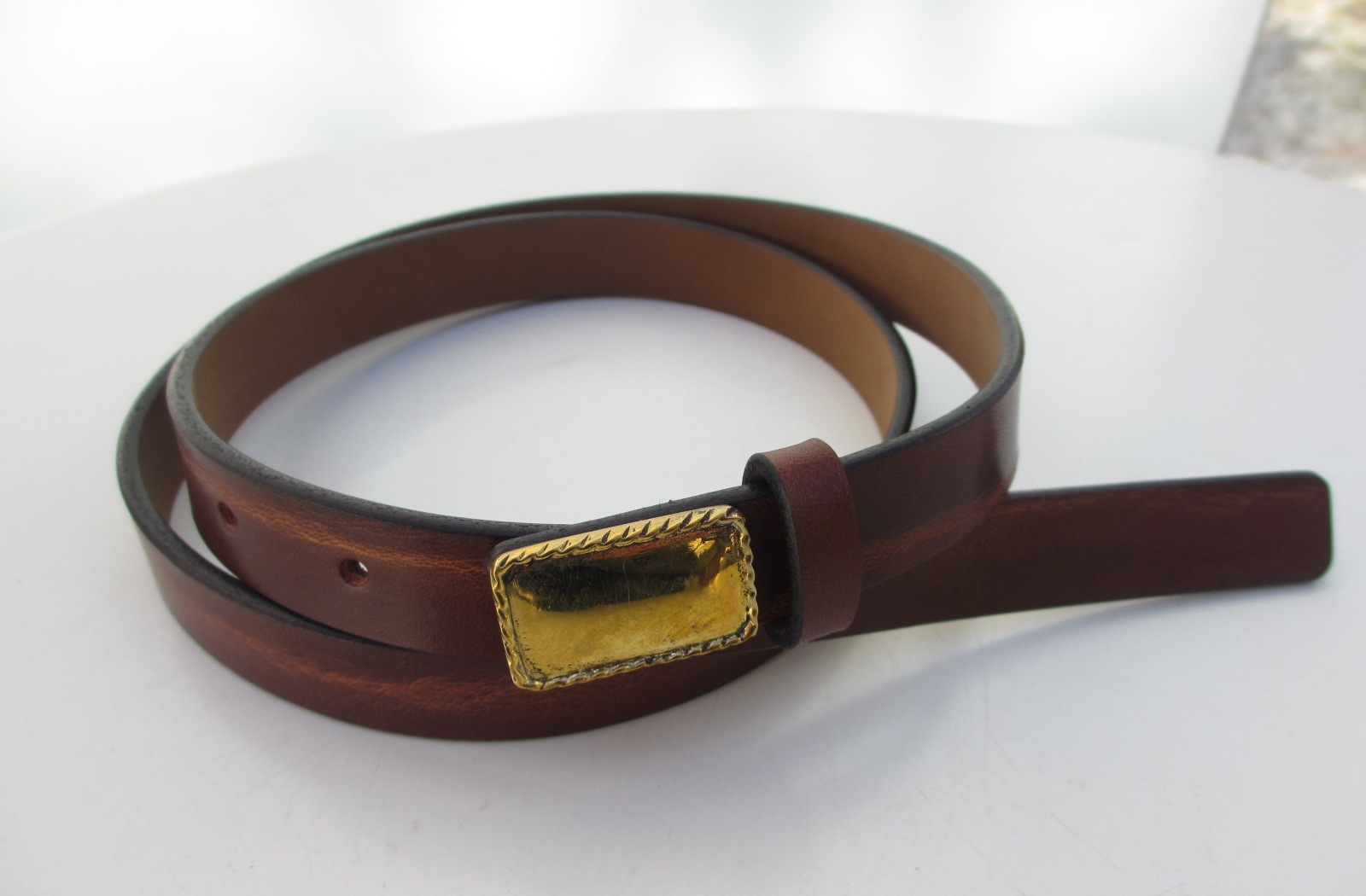 イタリアンレザーの素朴な風合いにゴールドのバックルが映えます。1枚革の素朴さと棒状バックルのヴィンテージ感、さらに2.0cmの細幅と絶妙なバランス感覚は、さすがです。