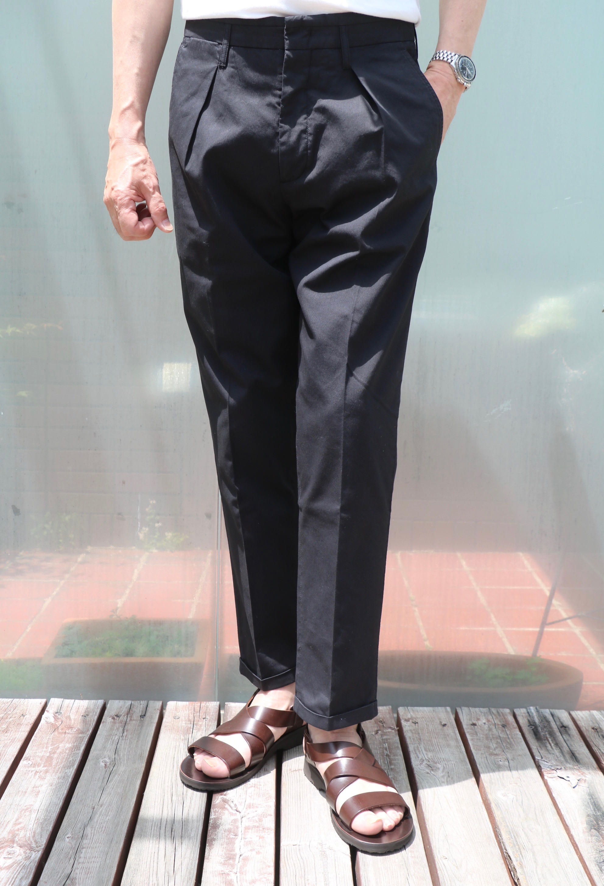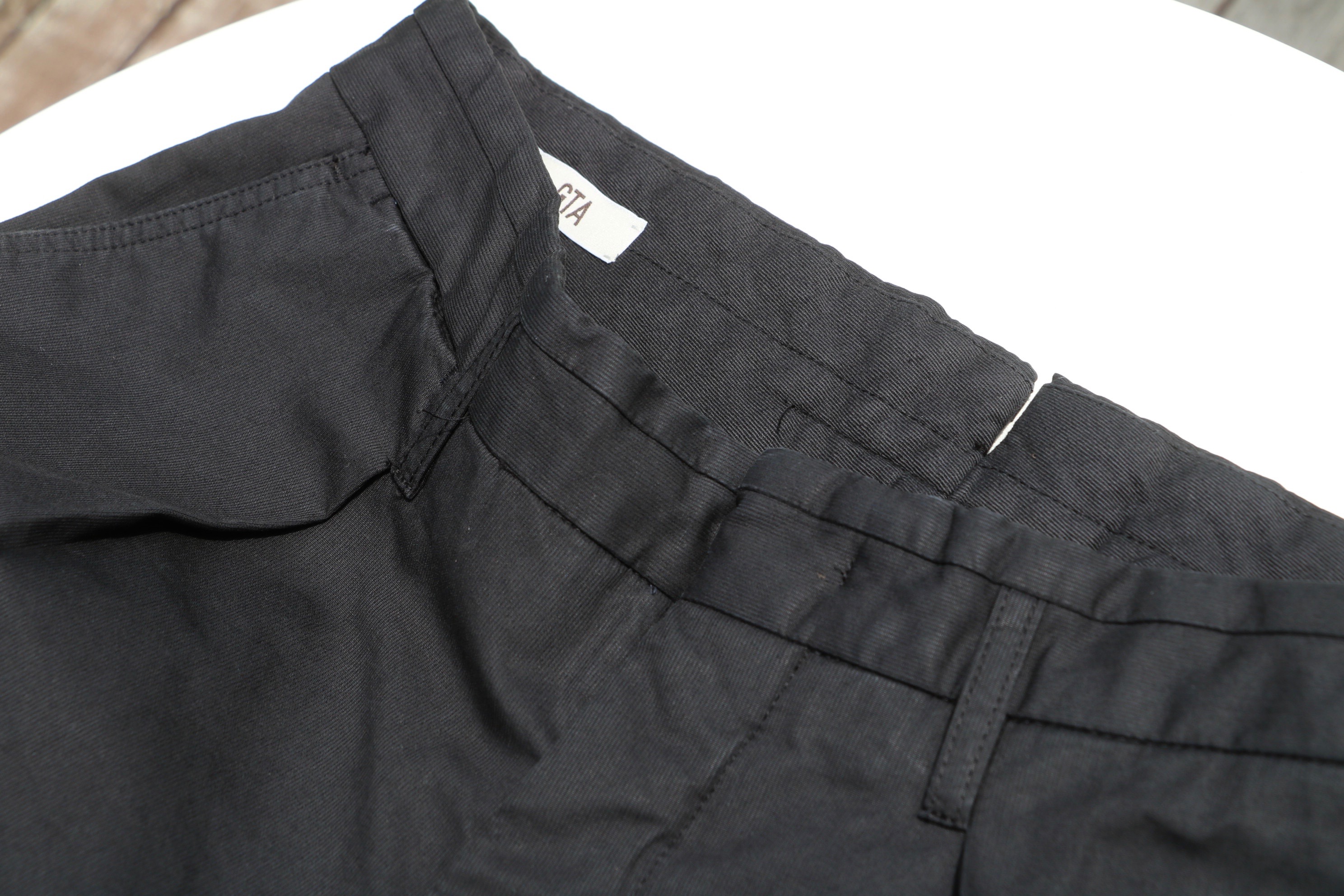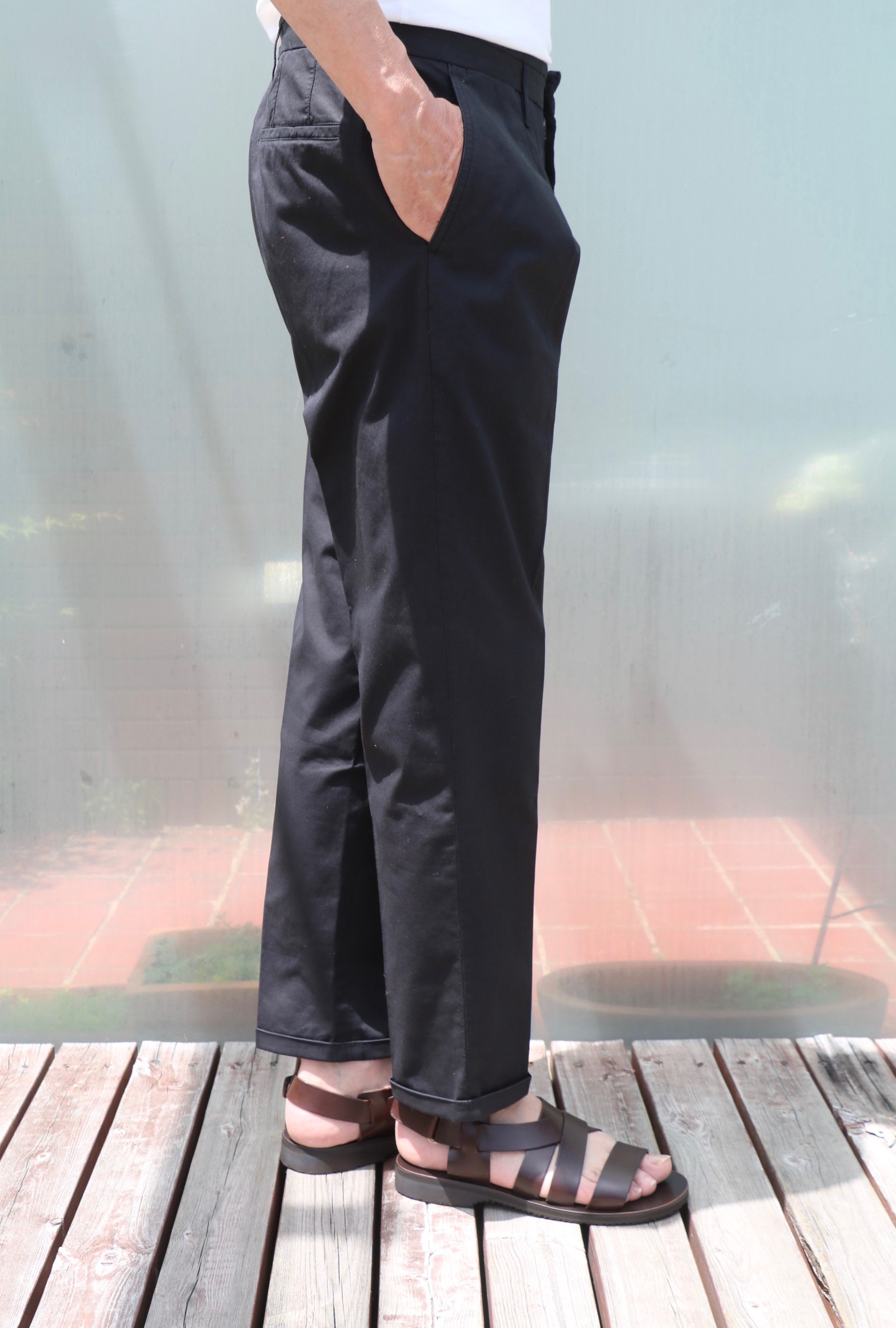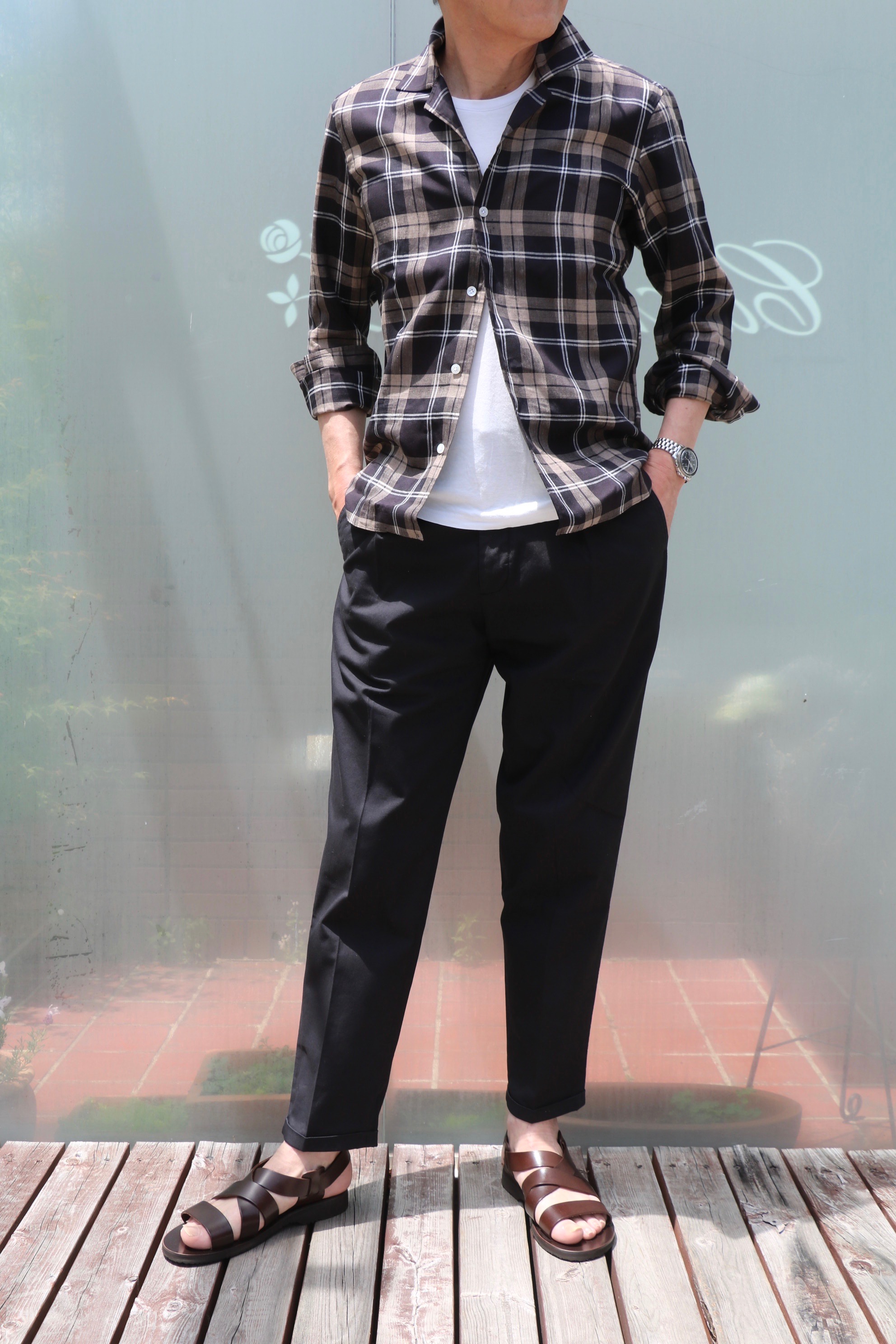 モデルは身長175㎝、体重64㎏、胸囲92㎝で、オフホワイトはサイズ44をジャストで、ブラックはサイズ46をゆとりを持って穿いております。ブラックで合わせたシャツはMaria Santangelo(マリア サンタンジェロ)、Tシャツは私物、足元はParaboot(パラブーツ)のグルカサンダルに履き替えました。手に持った巾着(未公開)はカシェートで展開しております。