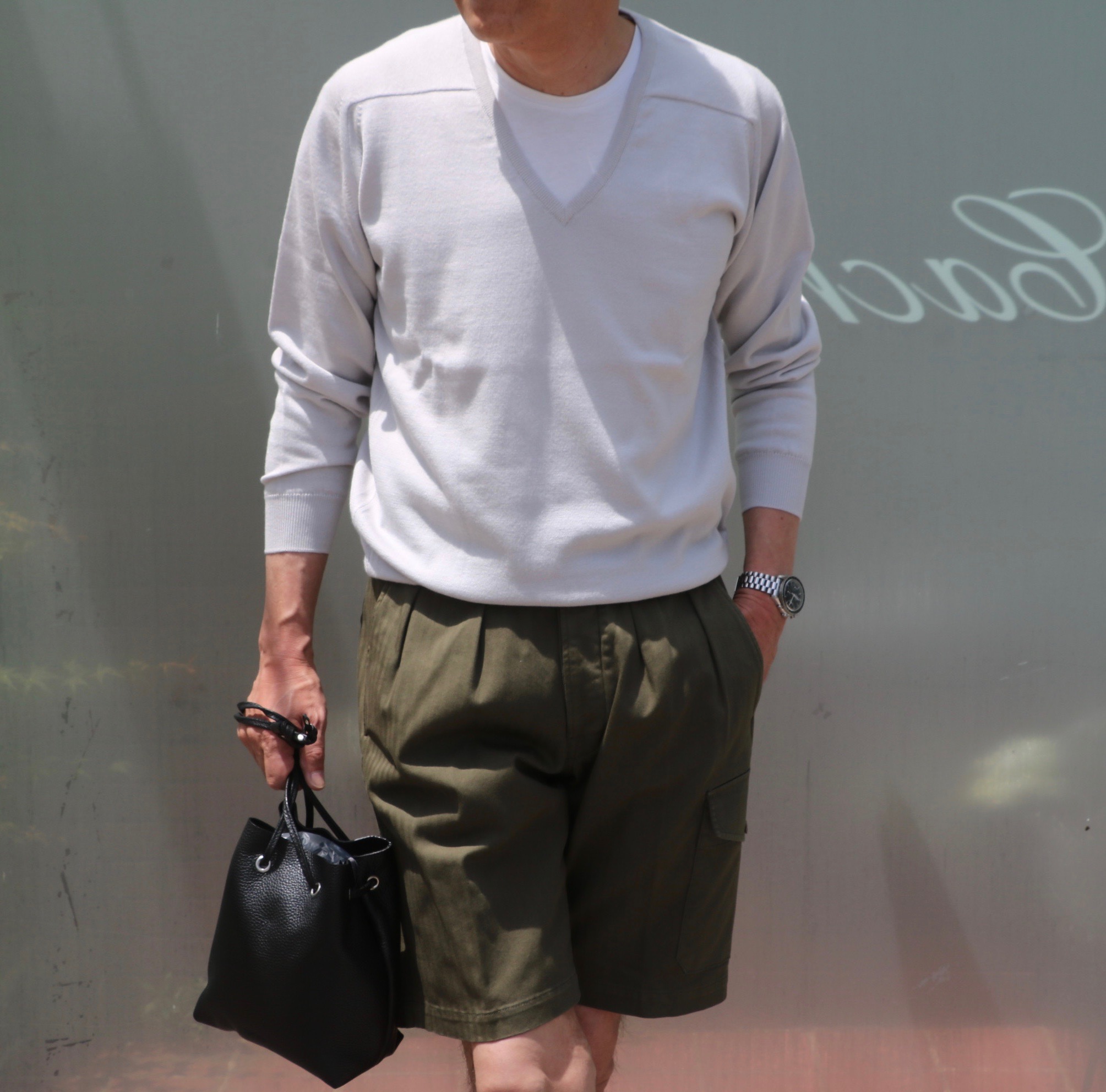 まずは、こちら。気温が上がったことで、深めのVゾーンが涼しげなJOHN SMEDLEY(ジョン・スメドレー)の「S4410」に穿いたのが、こちら。その前に、手に持っている巾着。こちらもカシェートセレクト。ご案内はもうすぐ...だと思います。