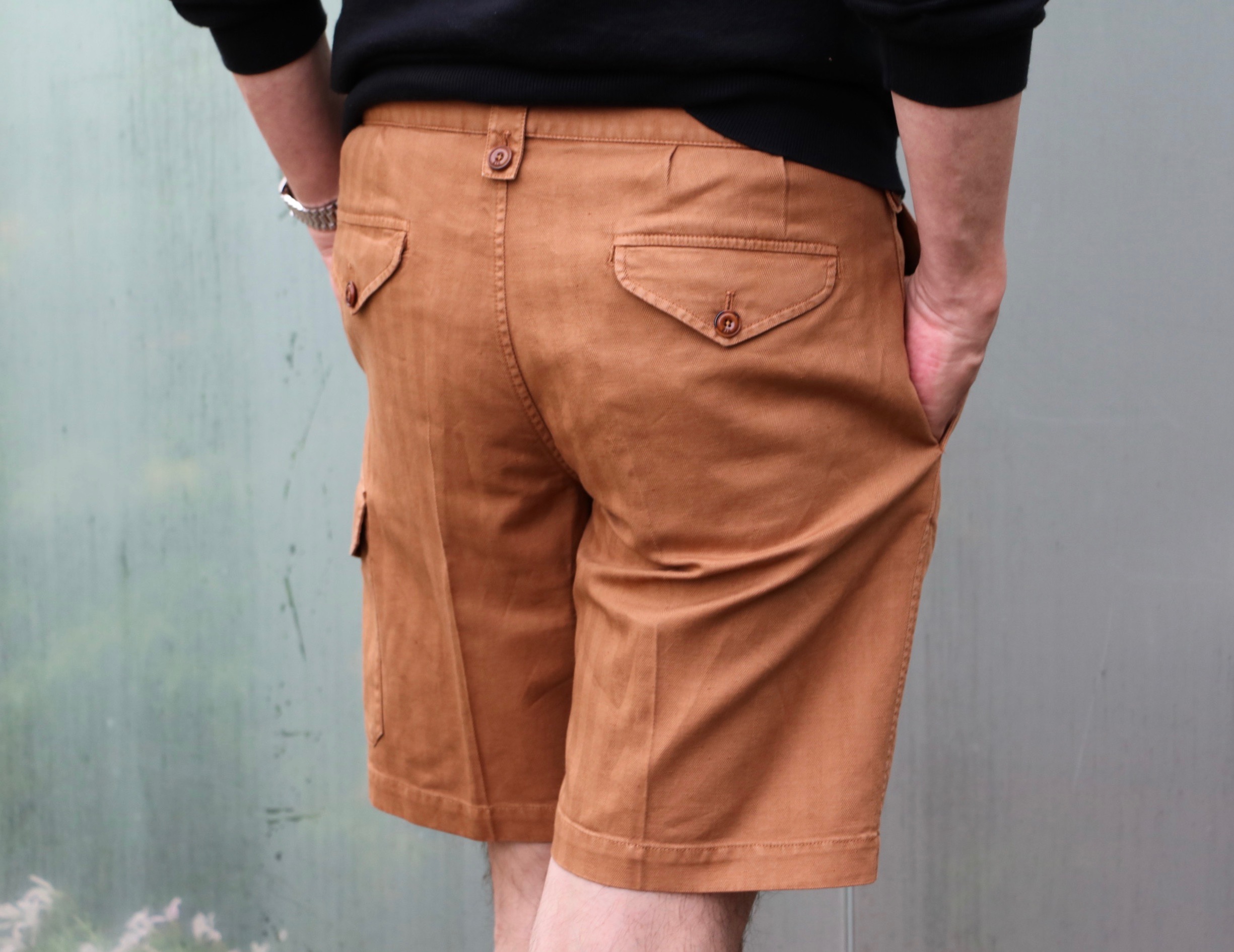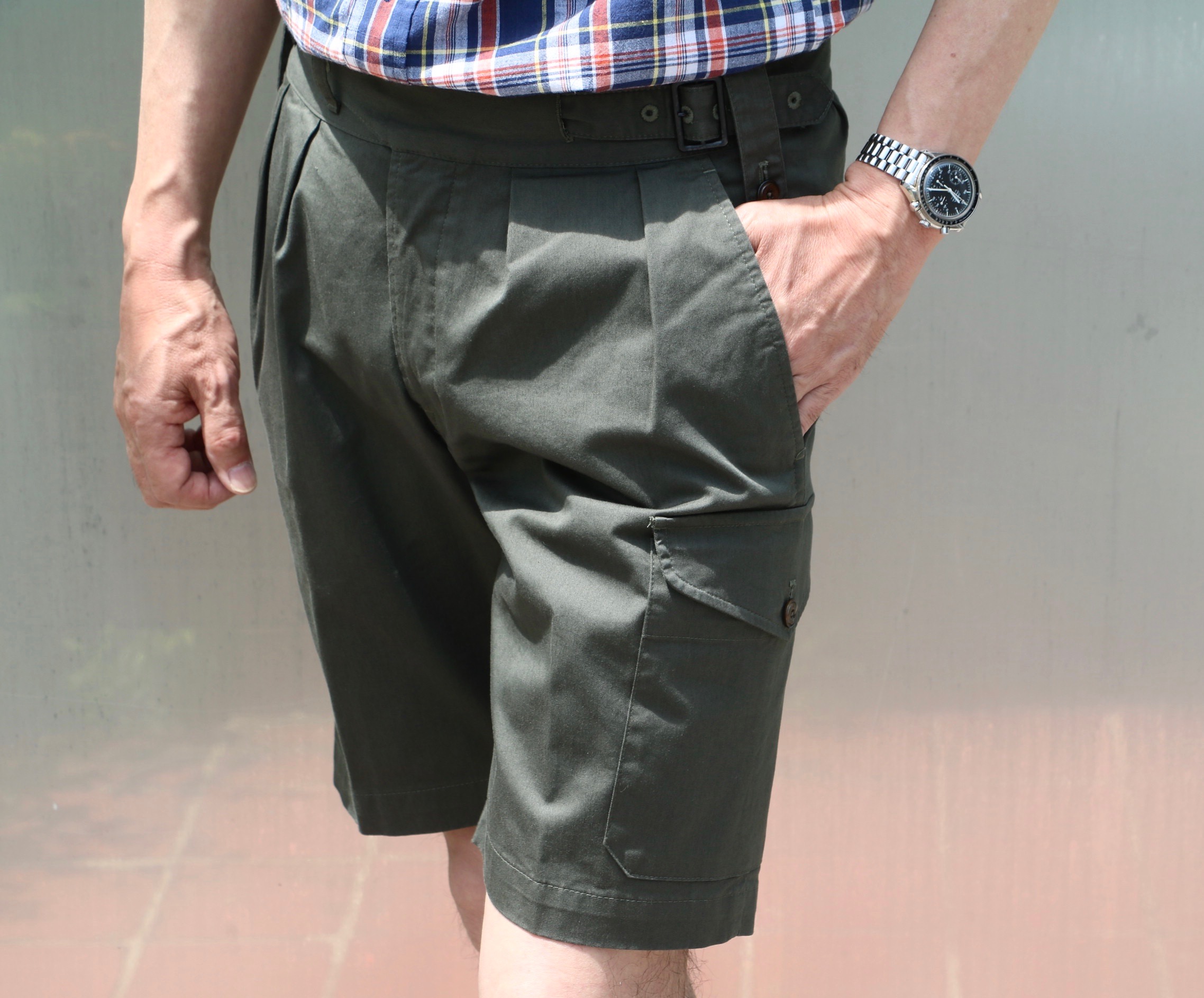 モデル名は「GHURKA SHORT」。昨日ご案内のオフホワイトの色違いではありません。同じようなヘリンボーンの地柄が入りますが、こちらはコットンベースのストレッチ。ミリタリー色の強いオリーブグリーンでご提案です。