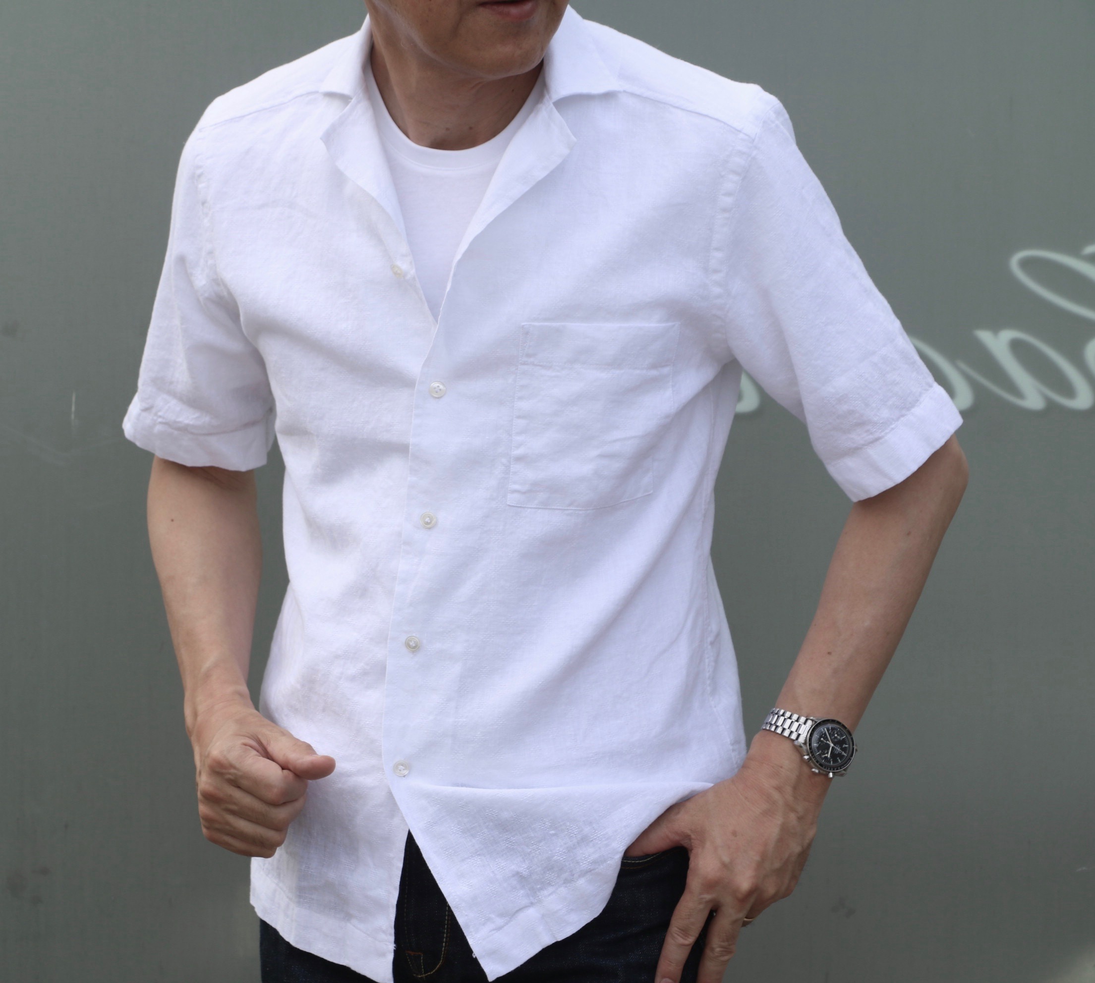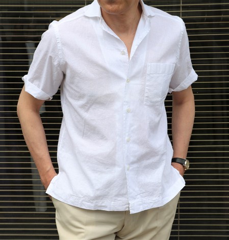 以前、動画やブログでご案内させていただいた「NCANNES」リネン・コットン ドビー柄スタンドカラーシャツと同素材になります。生地の凹凸感が表情を豊かにし、肌に触れる部分が少ない為、より涼しく感じるはずです。