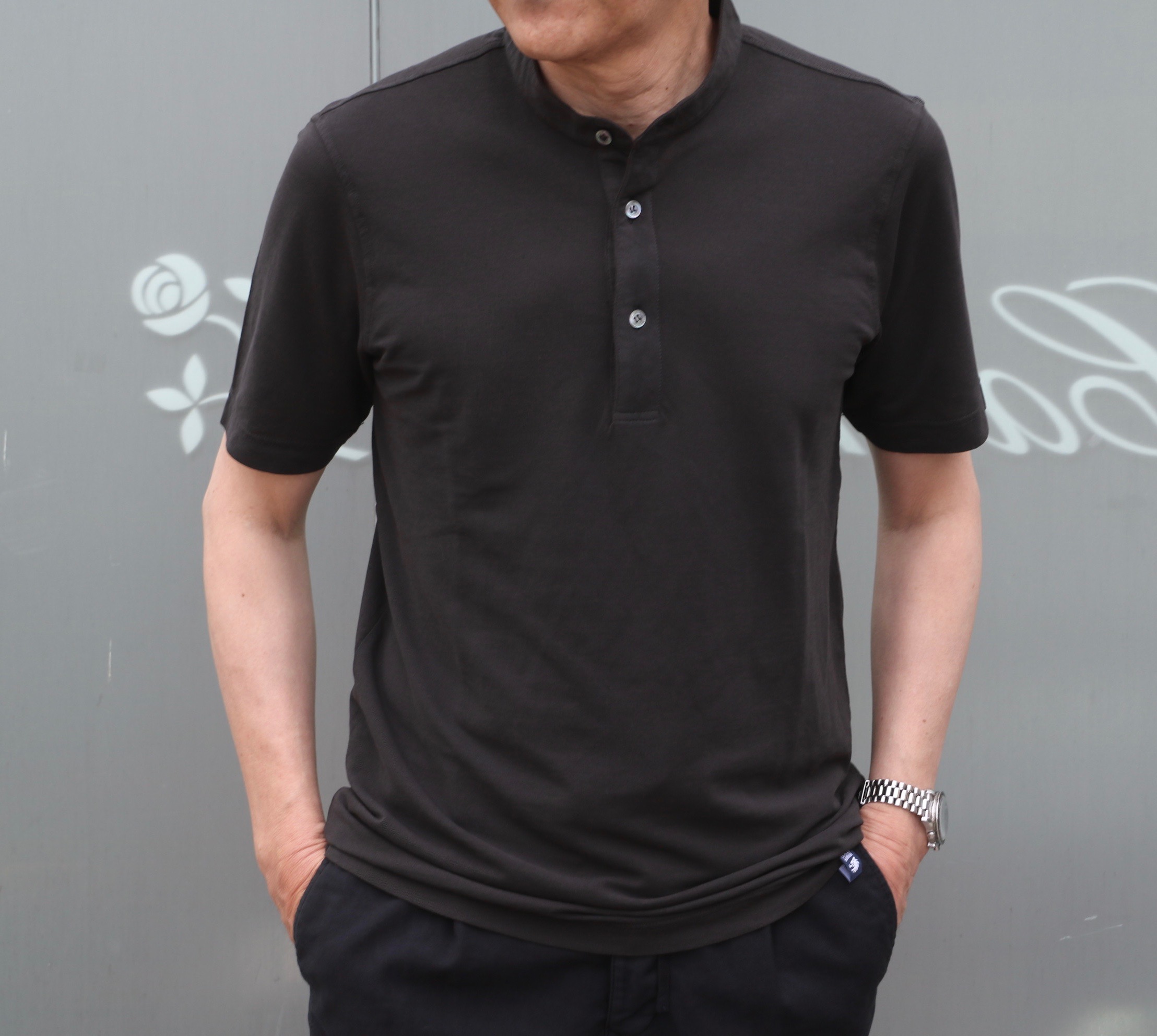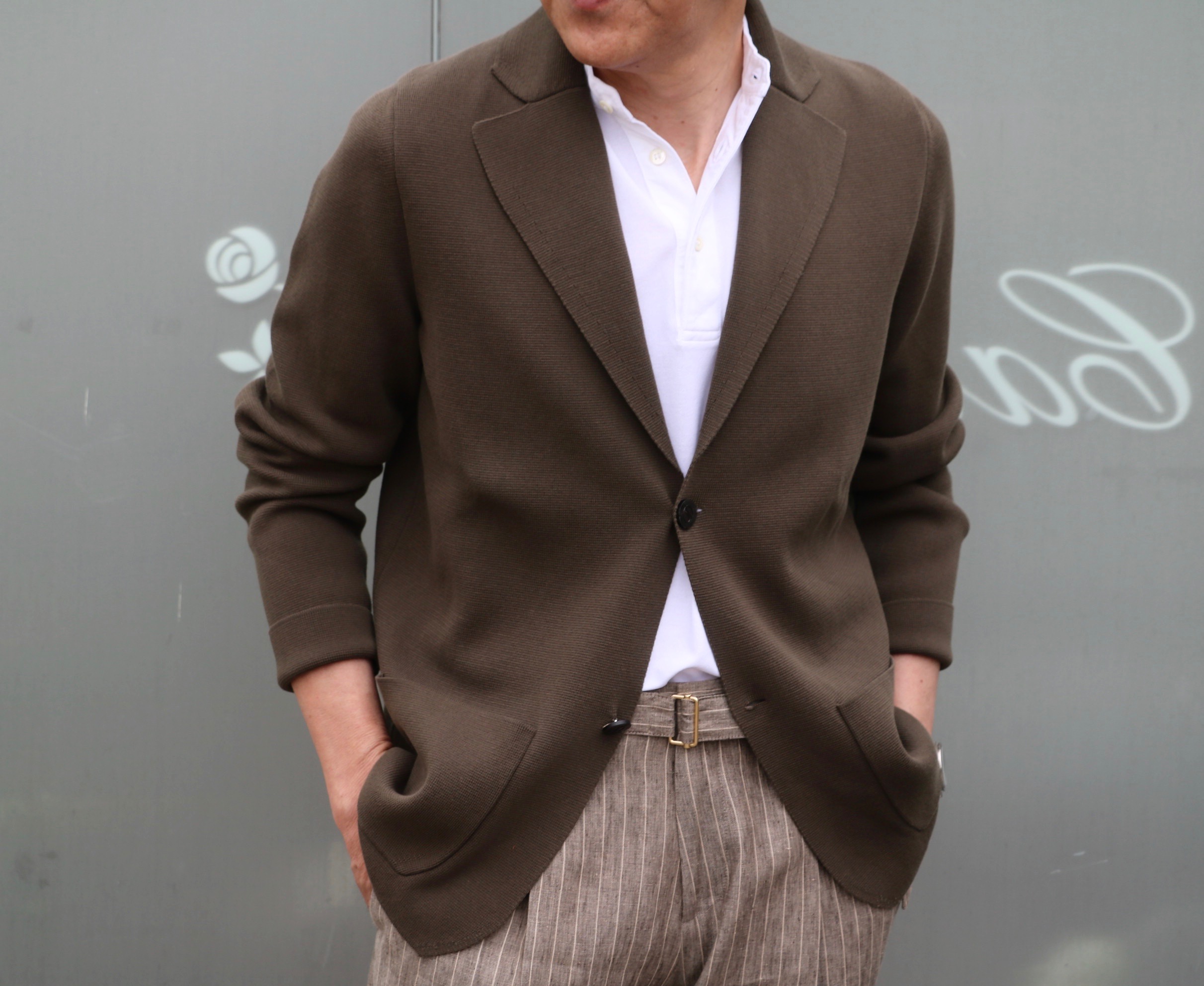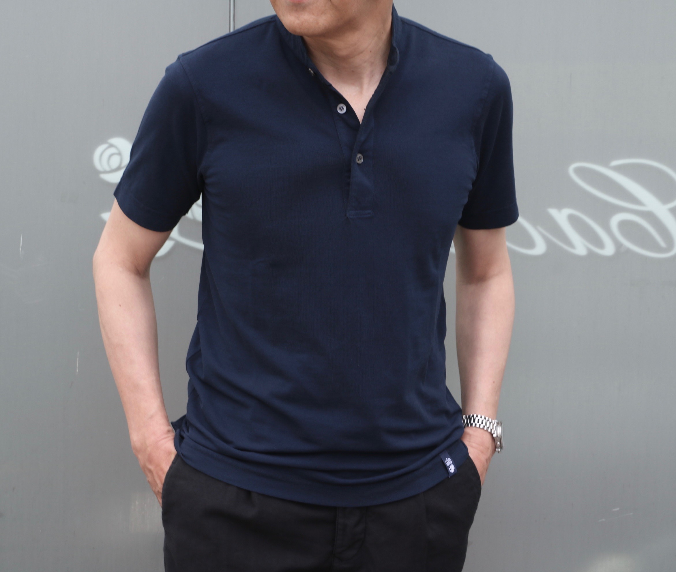 人気のストライプ柄のパンツは、BRIGLIA 1949(ブリリア)。持っていると重宝するDrumohr(ドルモア)のミラノリブニットジャケットを羽織り、ご案内させていただくのは、中に着ている【Drumohr/ドルモア】のプルオーバーのスタンドカラーTシャツ。