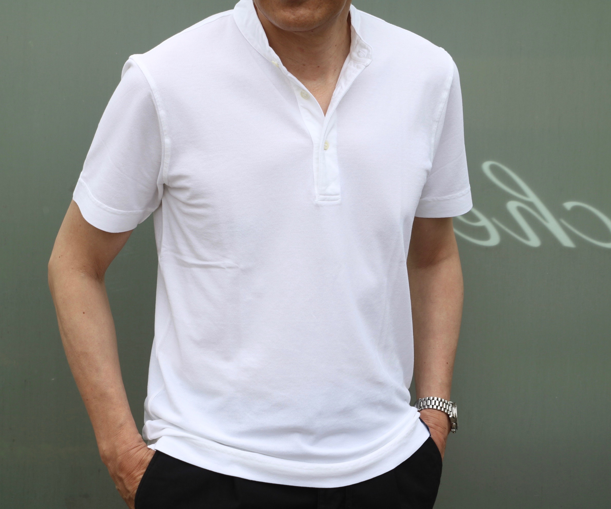 生地はドライタッチなコットン。ガーメントダイのヌケ感のあるスタンドカラーTシャツです。