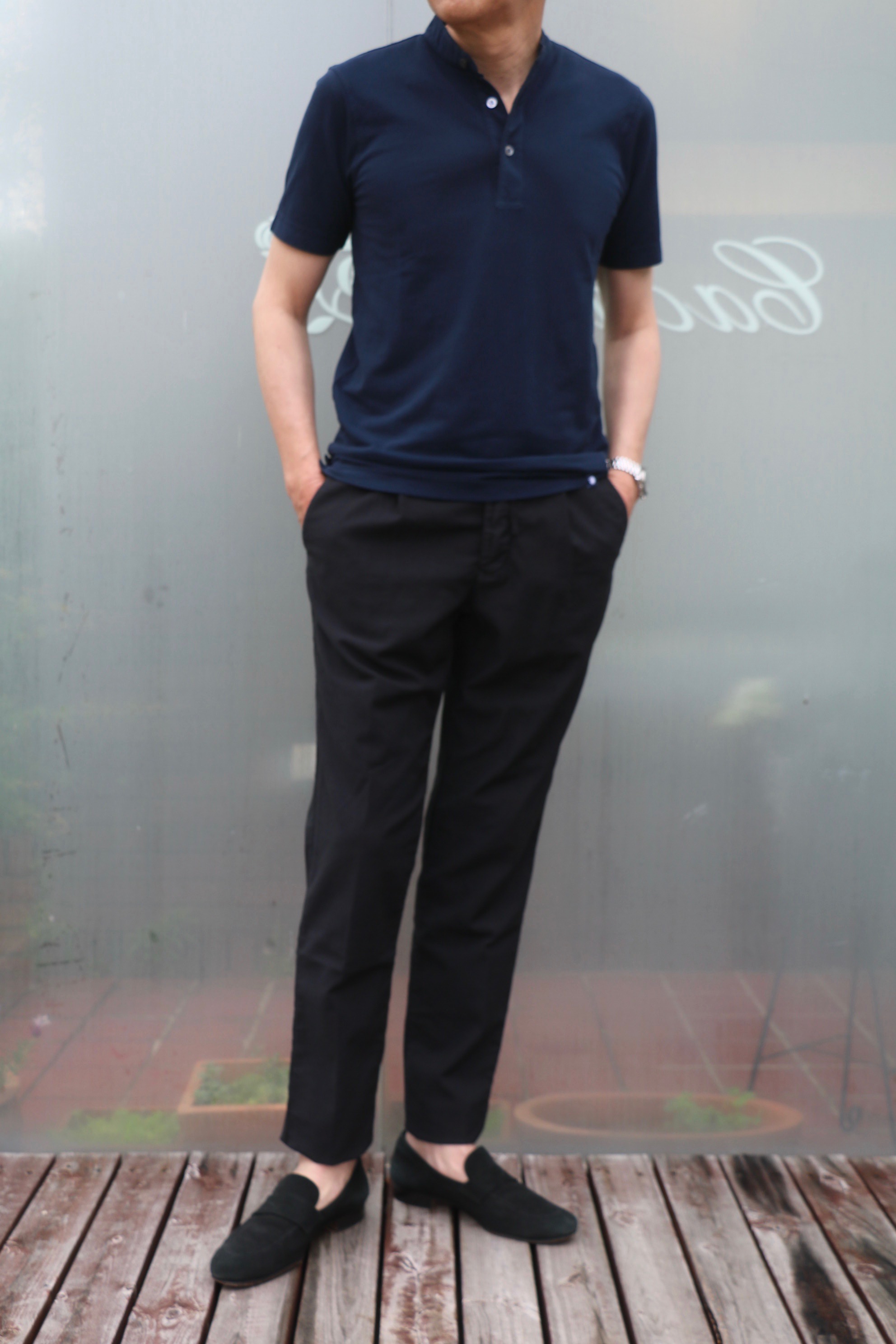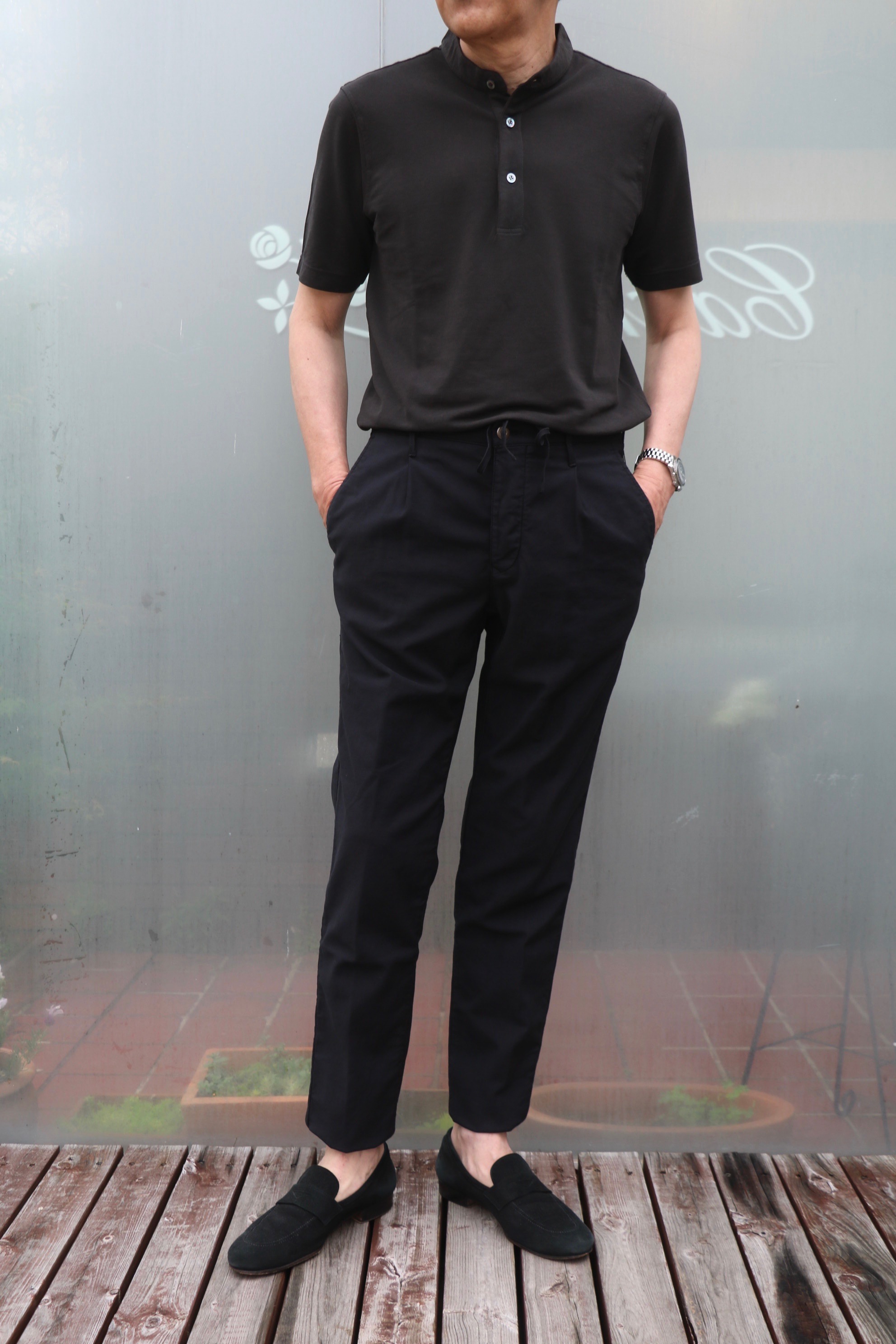 参考までに、パンツは INCOTEX SLACKS(インコテックス スラックス)の「製品染めドローコード付きシャーリングパンツ」。きちんとしながらも程よくリラックス感を楽しめる、いい感じに穿けるパンツです。こちらのブログでご案内しておりますので、ぜひご覧ください。