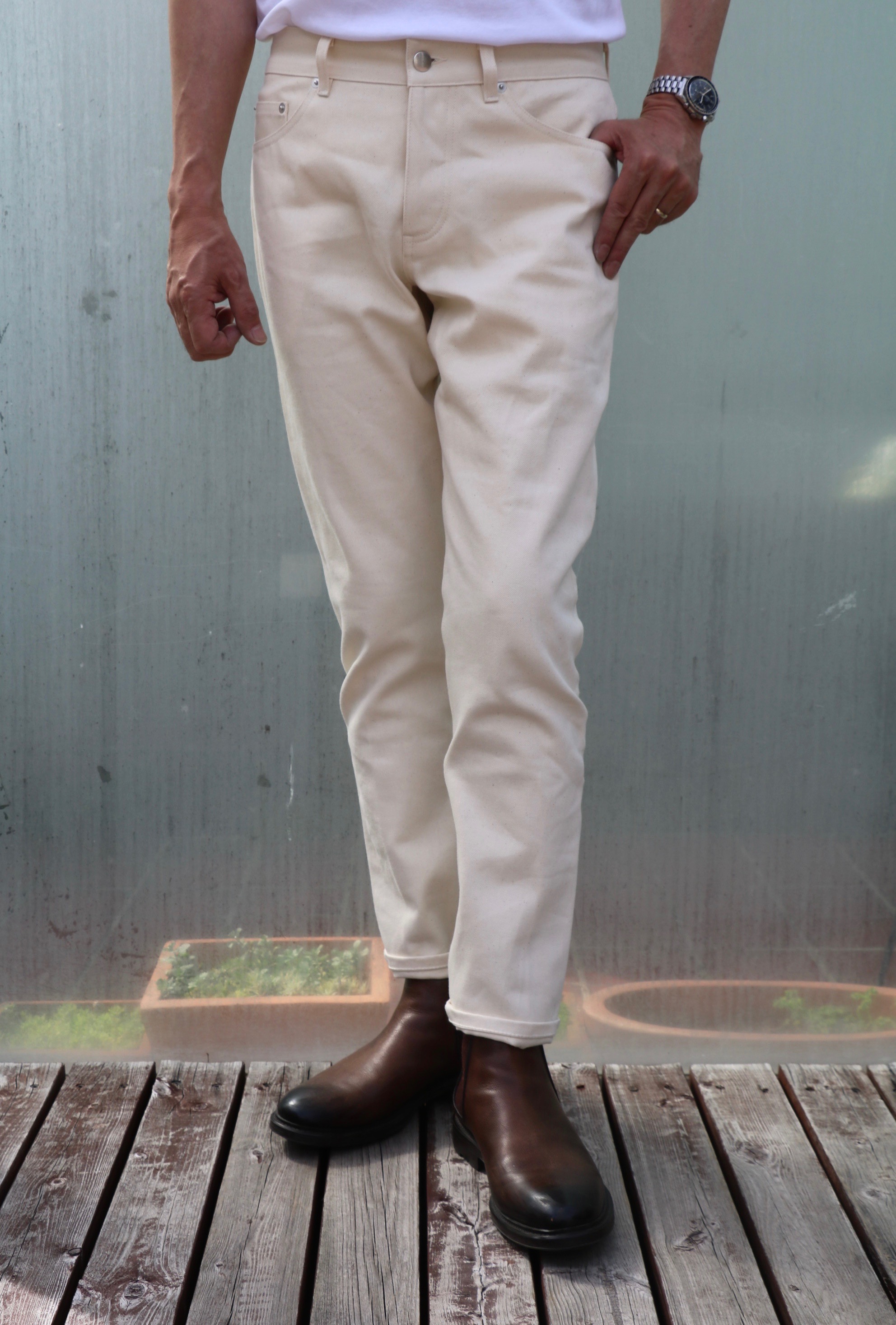同じく「Semi Slim」のホワイトデニム。未公開ですが、そっと穿いてみました。インディゴブルーに比べると、少し柔らかな穿き心地です。クリームがかった生成りであれば、ホワイトが苦手な方でも、気楽に穿いていただけるのではないでしょうか。