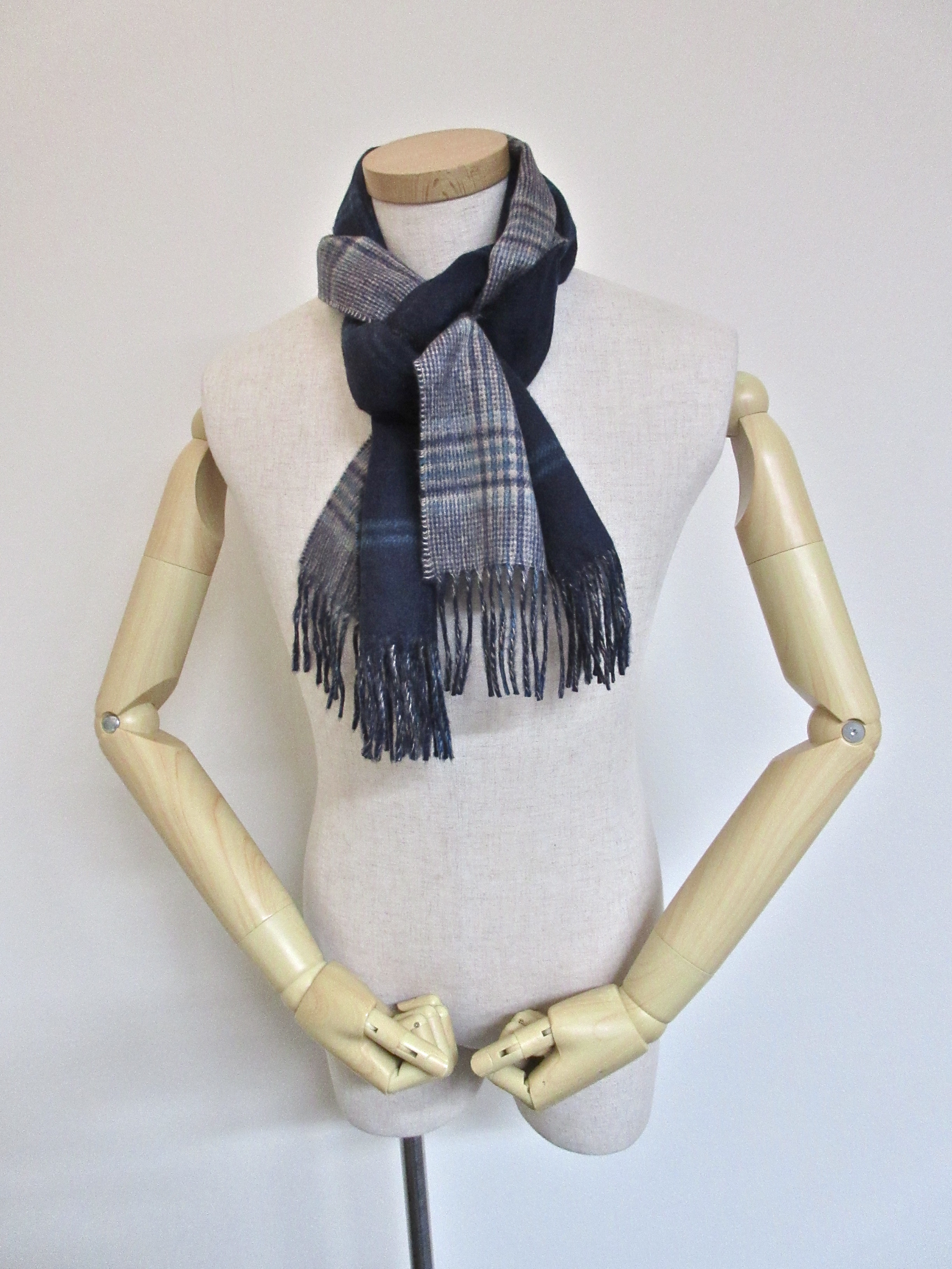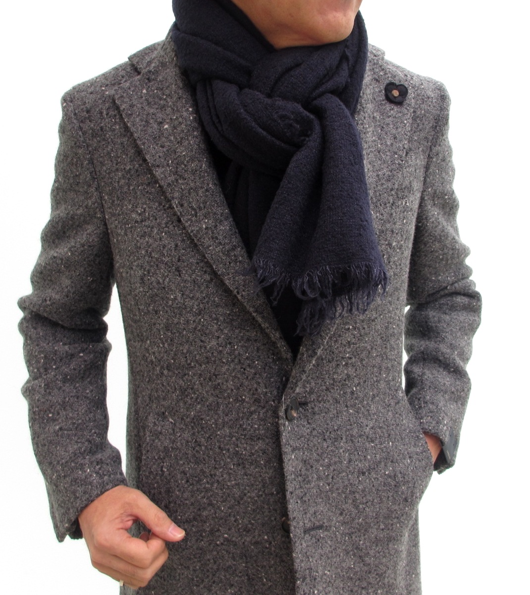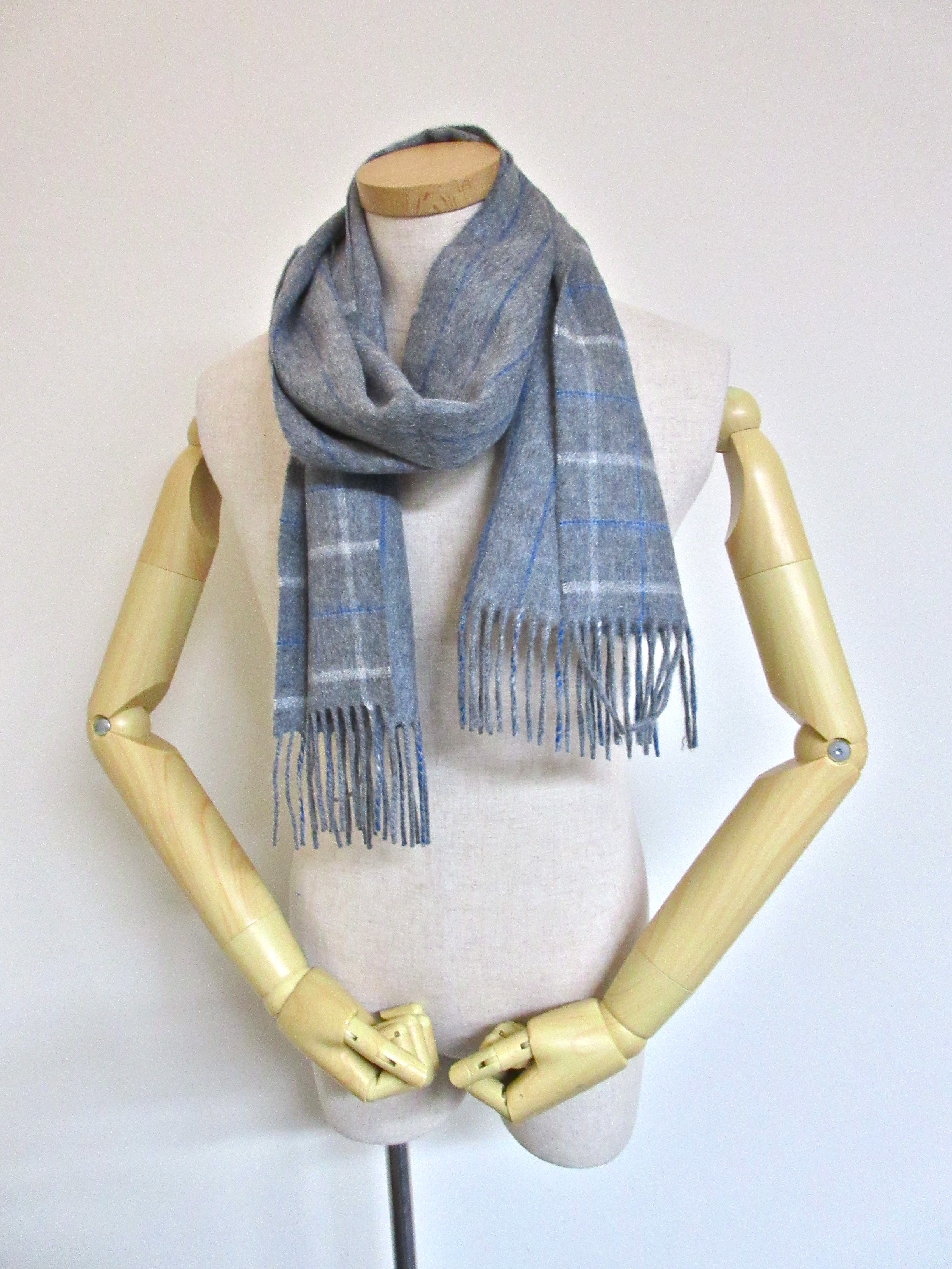 そして今回、無地もセレクトしました。左からネイビー、中間色のレドグレイ、ライトなスカイグレイ(実物は、もう少し暗くなります)と、どれもクールな色合いですが、巻いてみると、最上級のカシミアの温かさと肌触りに思わず顔がほころびます。さらに上品な光沢が周囲を照らし?、その明るさに美しい女性が集まって...は来ませんが、ひょっとしたら、おねだりされる可能性は高いはずです。心して巻いてください。