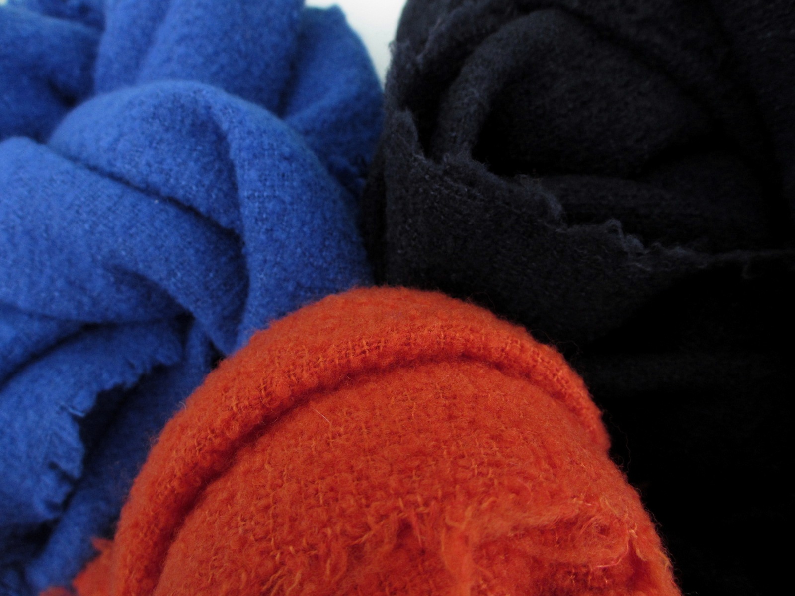 2色あるグレイは、どっちがどっち?と言われてしまいそうな解り難い色ですが、アップで見ると、上に重ねているのがレドグレイで、下が杢グレイです。色目は似ていますが、色がストレートに出ているレドグレイに対し、杢グレイ白い糸が混ざって柔らかな印象です。そして、肌触りも杢グレイの方がフワッとして柔らかです。