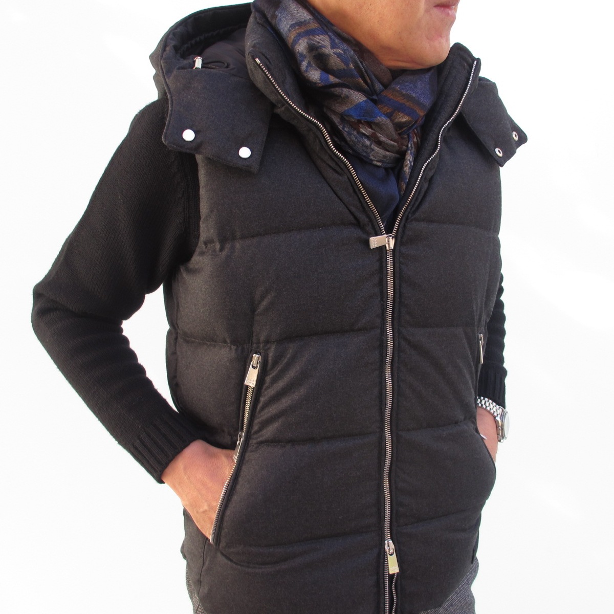 MODEL:「LEONARD」 ウール・シルク フード取り外し付きダウンベスト