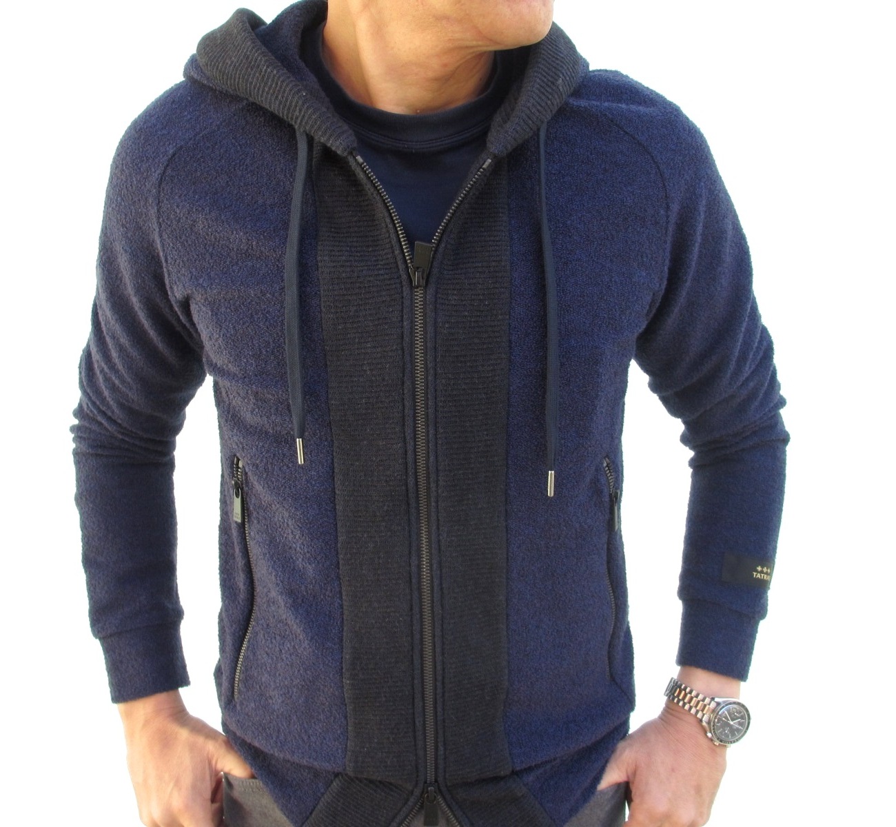 【TATRAS/タトラス】のコレクションの中で、毎回必ず提案されるパイル地。今回、切り替えにニットを使った、今までにないモダンな雰囲気で登場です。光沢のる毛足の短いパイル地とタイトなデザインがスポーティーなパーカーをモダンに見せます。