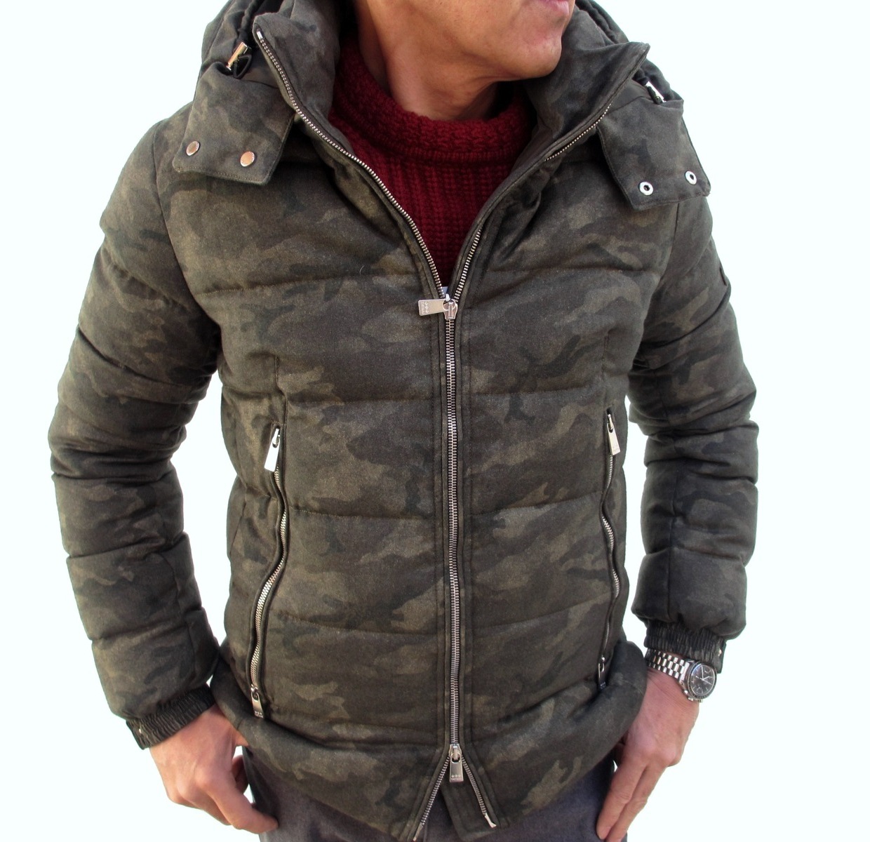 MODEL:「DONATELLO」 ウール・シルク 迷彩柄フード取り外し付きダウンジャケット