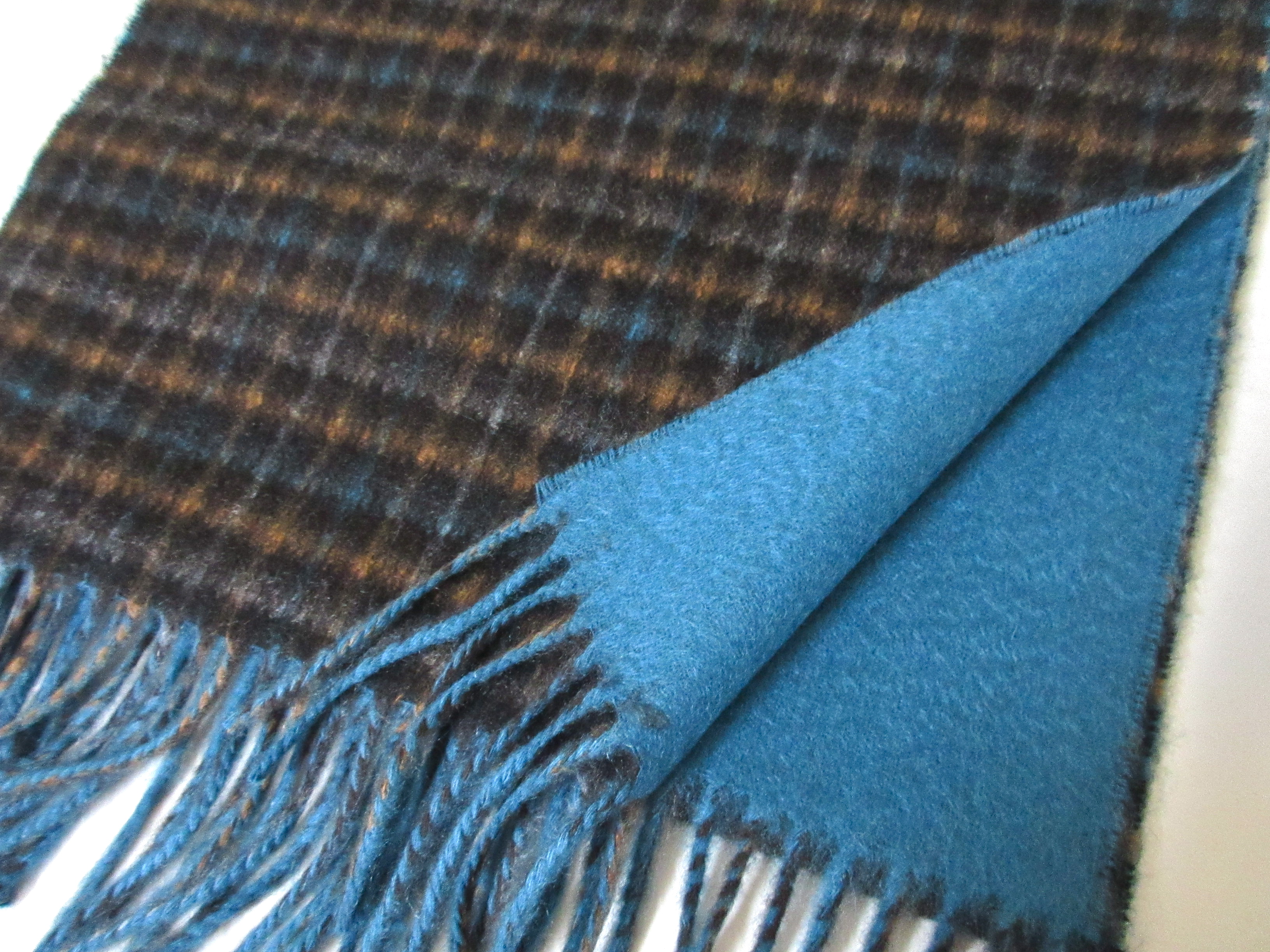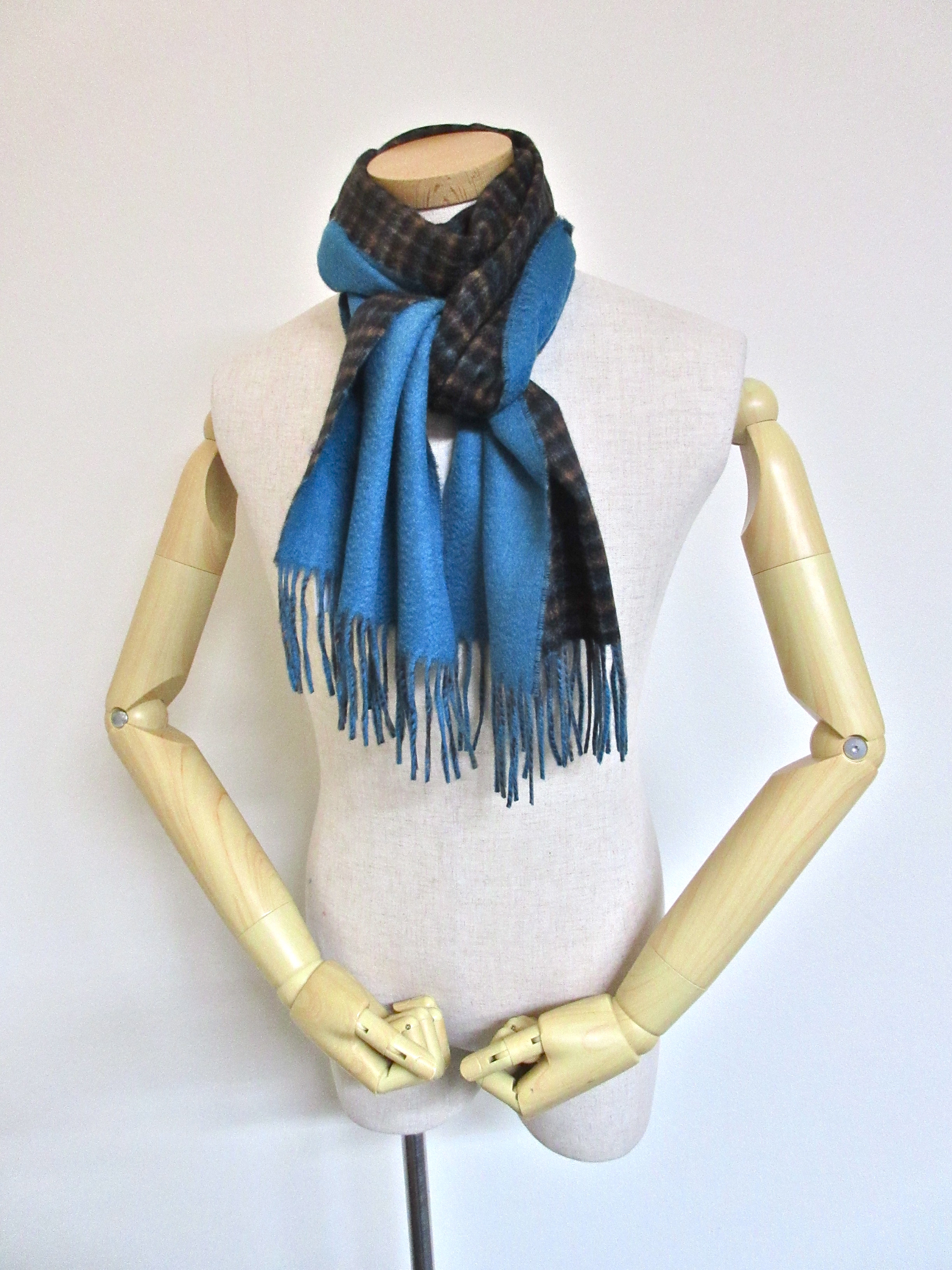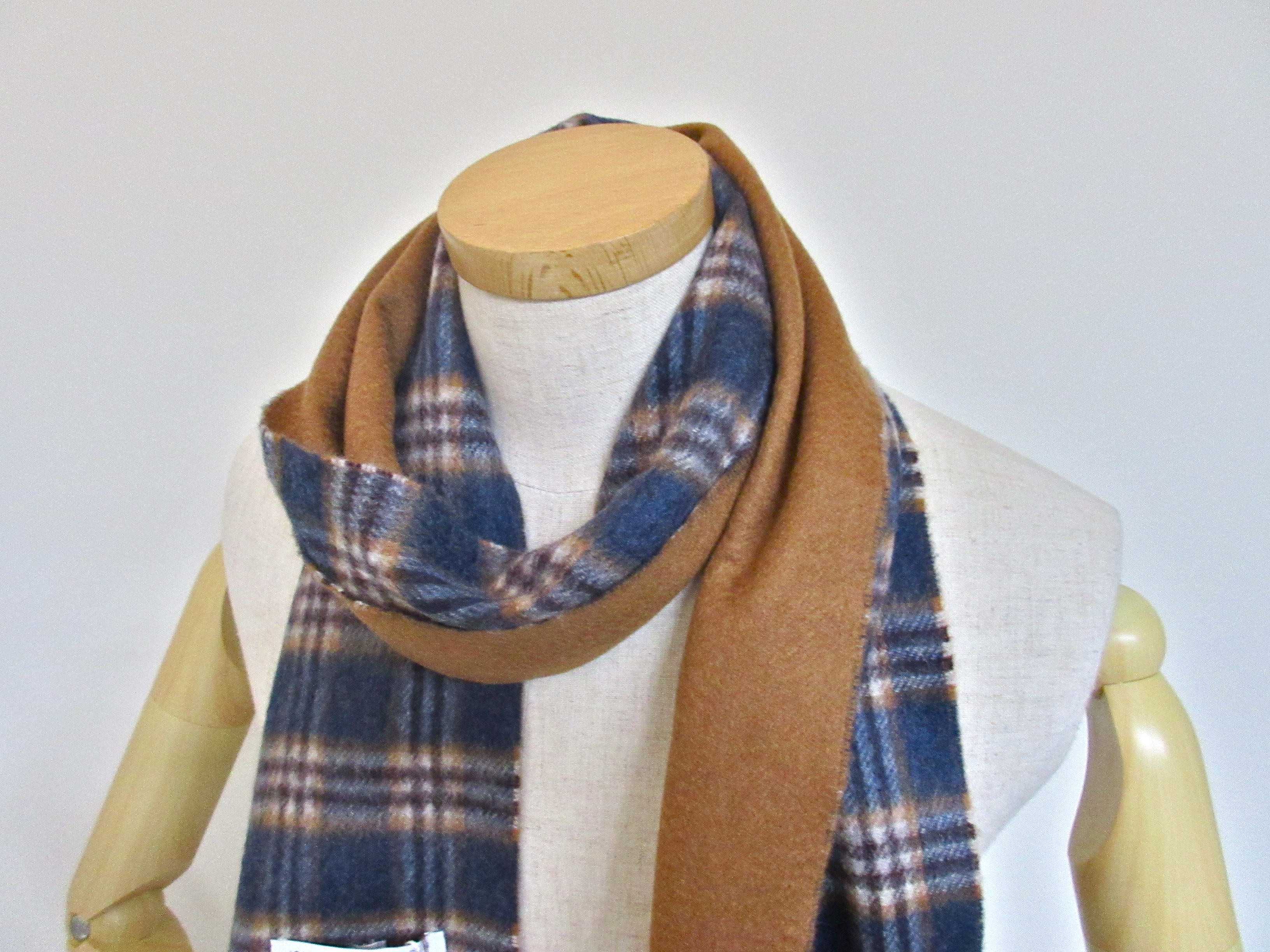 ブルーとブラウンのチェックに、裏面はライトブラウンの無地。ランダムに巻けば、意外と合わせやすいライトブラウンが、コーディネートのアクセントに栄えるでしょう。