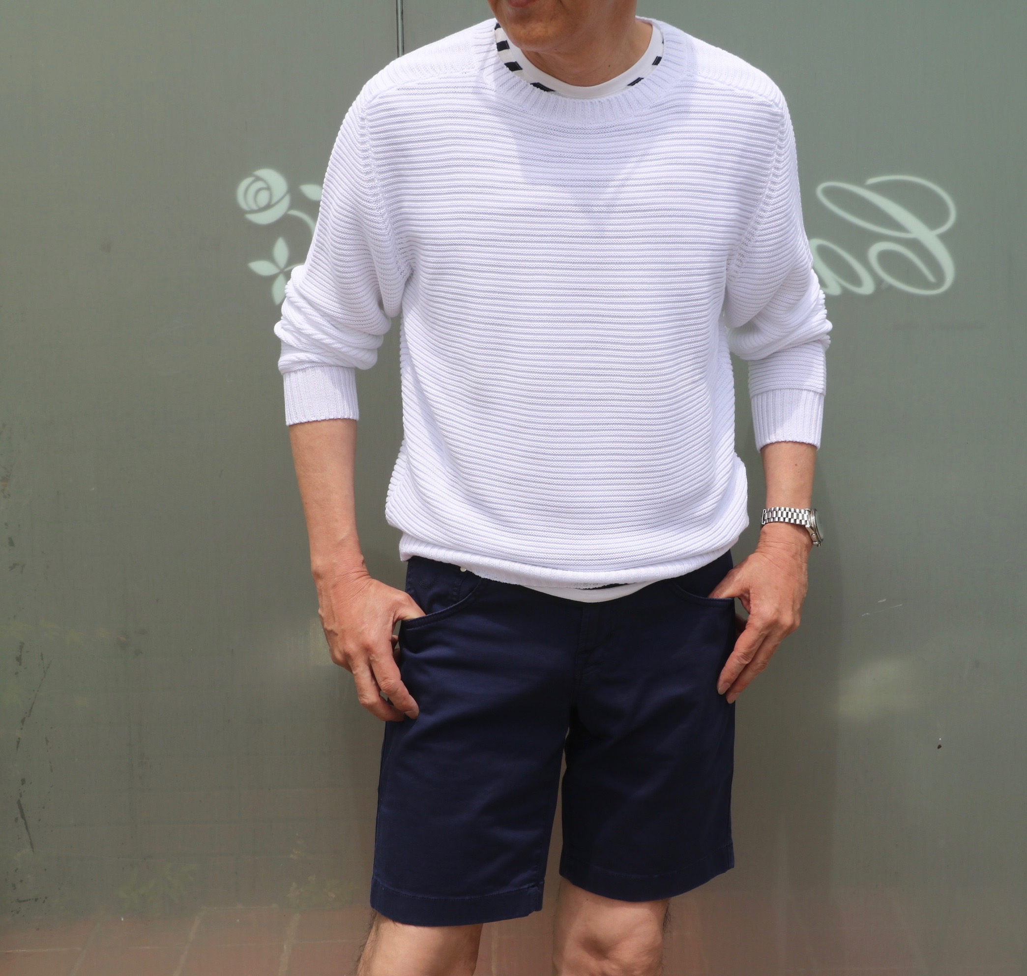 合わせたブラックのスウェットシャツはJACOB COHEN(ヤコブコーエン)、ホワイトのサマーニットはALFREDO(アルフレッド)のものです。