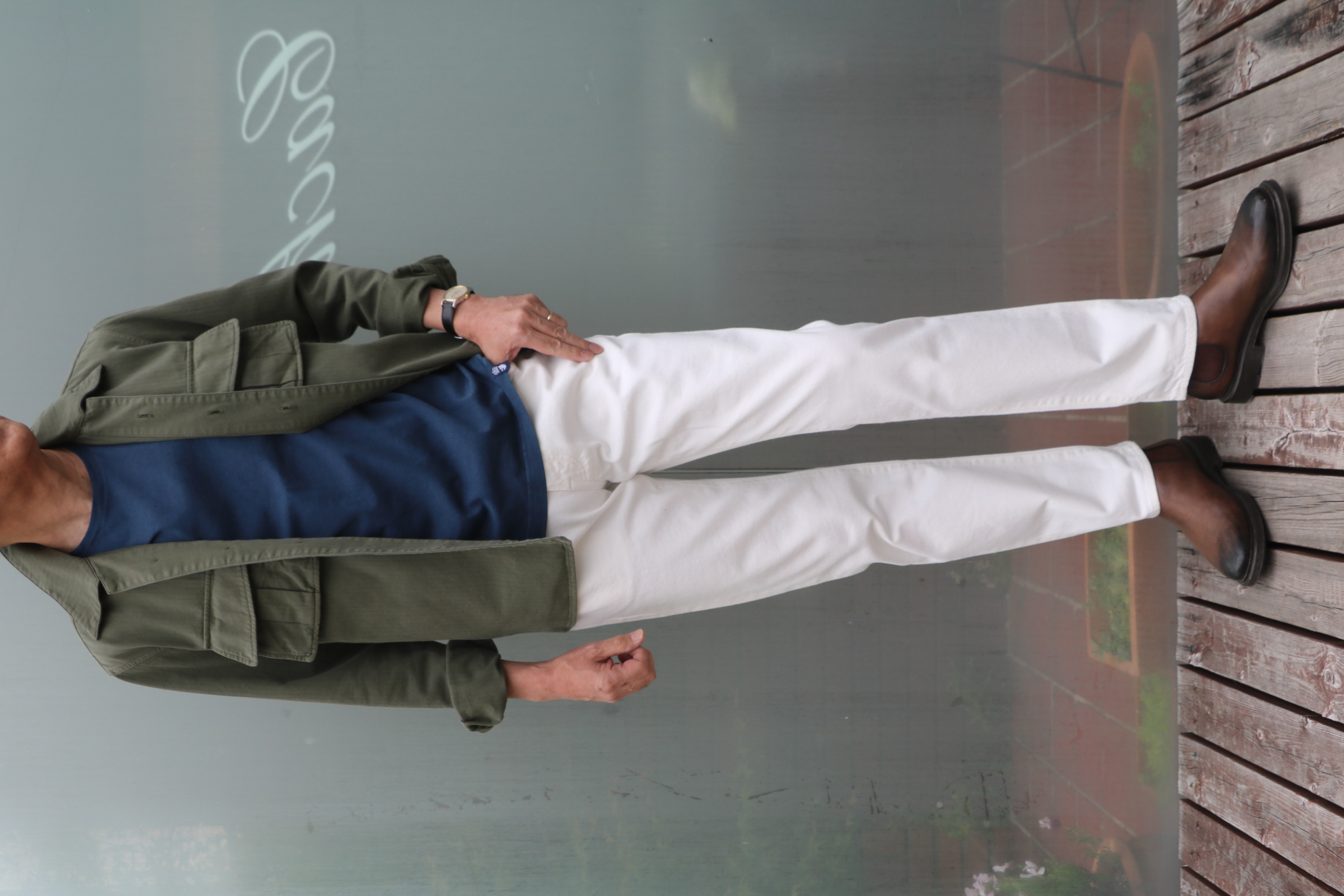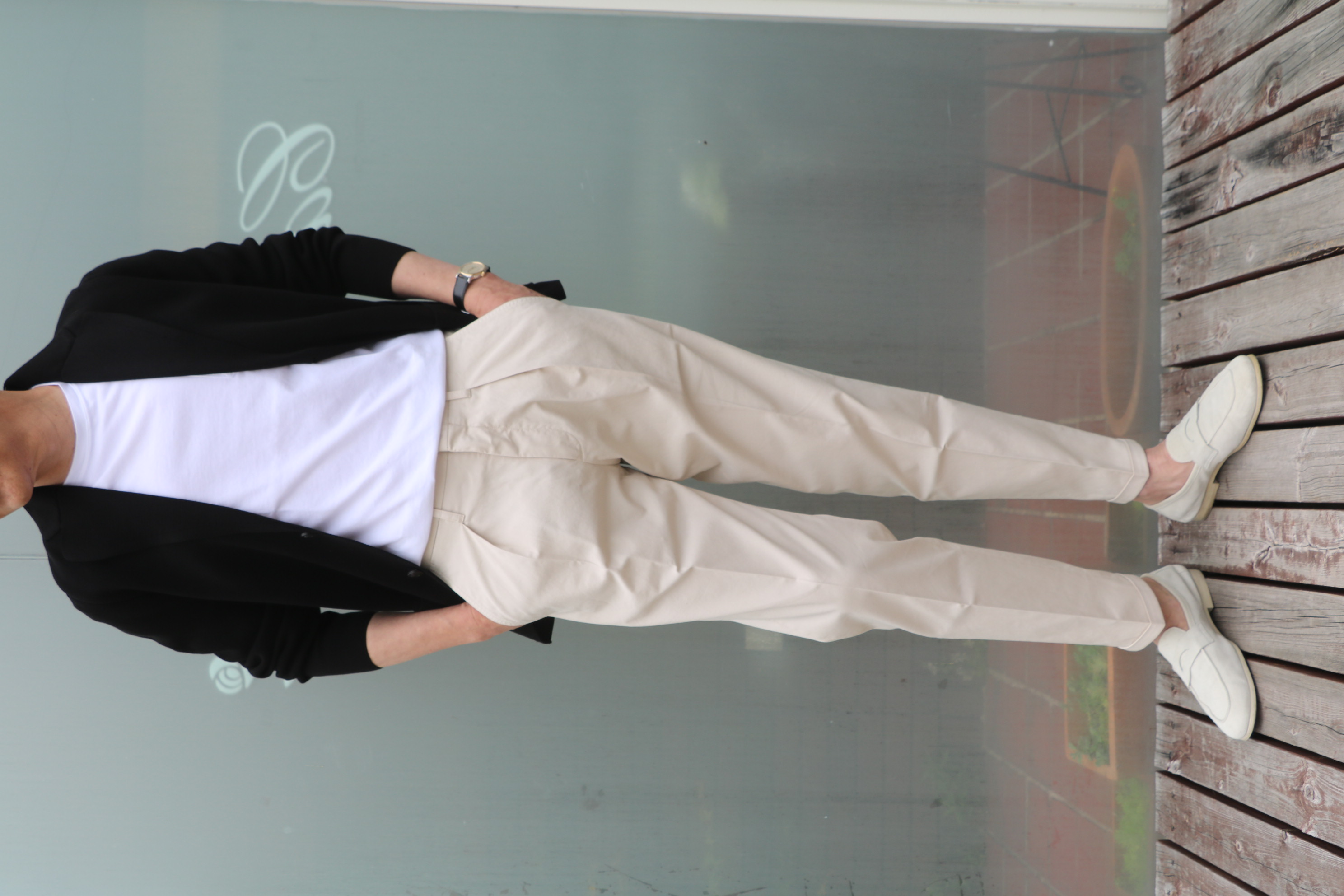 パンツをデニムから、何故かサイズ46のみが2本となっているINCOTEX(インコテックス)のICE COTTONストレッチパンツに穿き替えてみました。私の身長(175㎝)でサイズSを着ていますが、こんな感じです。