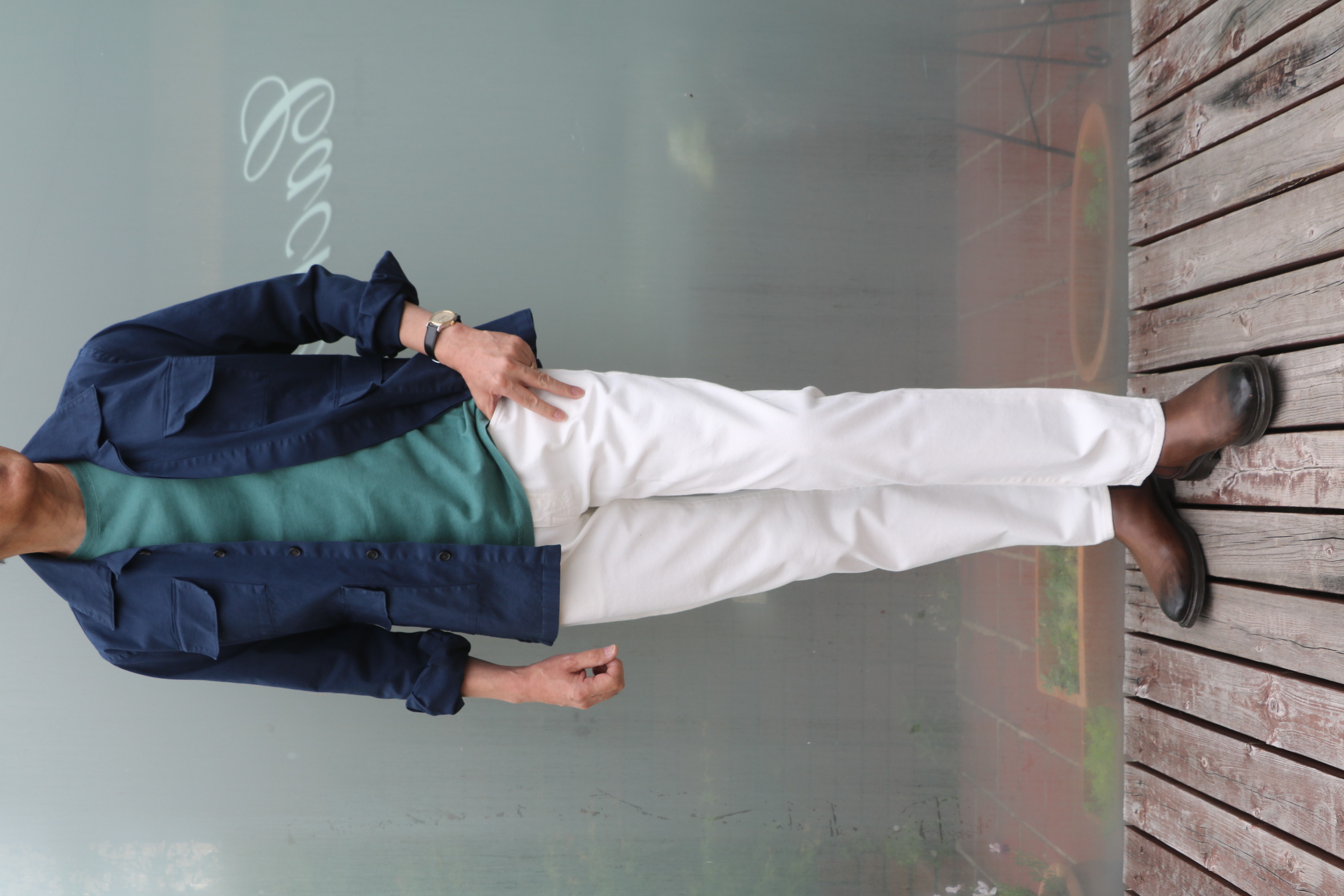ここでコーディネートといきたいところですが、入荷と同時にサイズ46のみ、ダブらせておいたのに完売。ネイビーのみの試着となってしまいました。