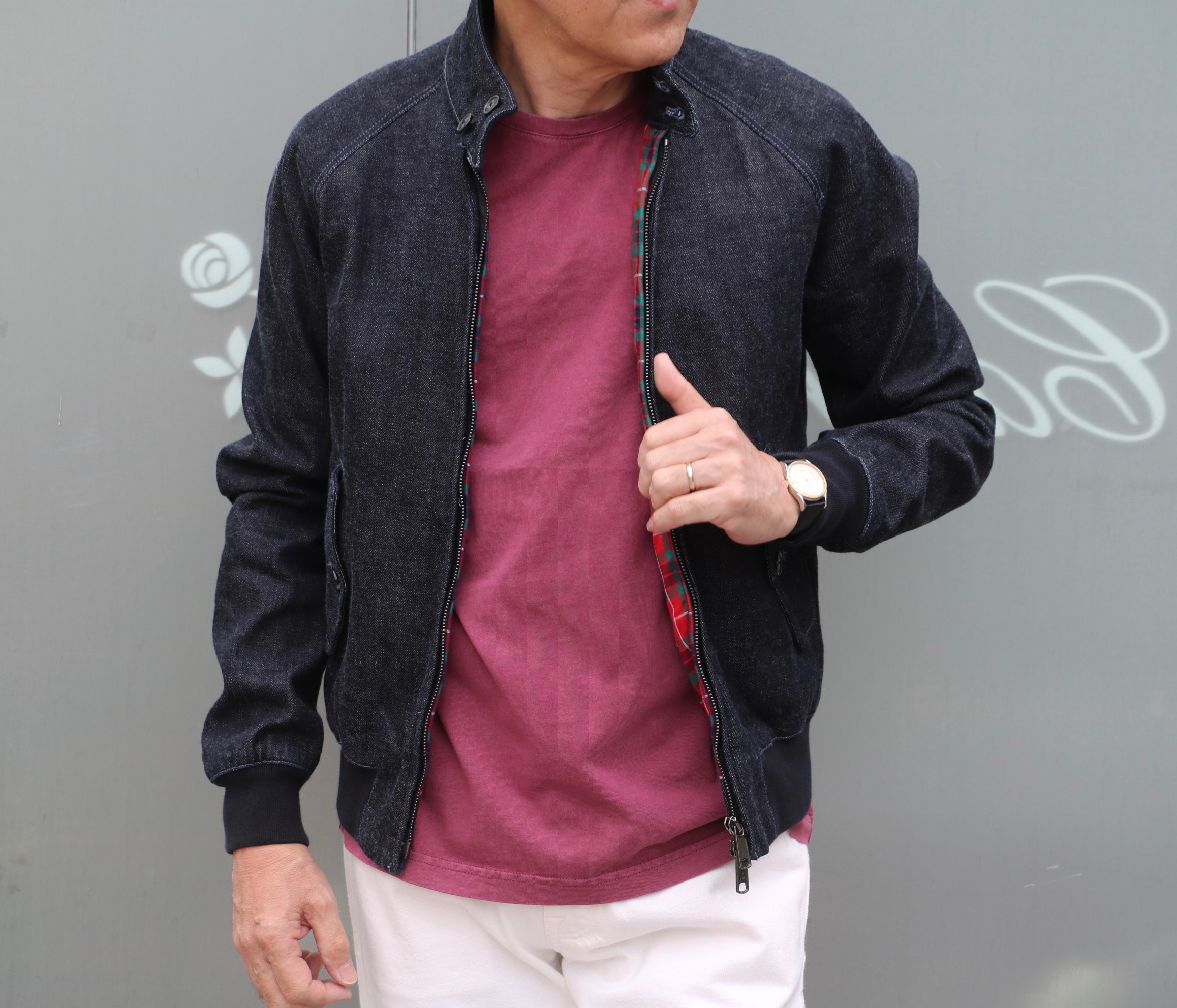 今日のような肌寒い曇り空なら、BARACUTA/バラクータのデニム地ハリントンジャケットに合わせても良いでしょう。梅雨前の気温の安定しない季節、暑かろうが、寒かろうが、短パンにTシャツは若者に任せ、大人は温度調整のできる服装を心がけるべきです。