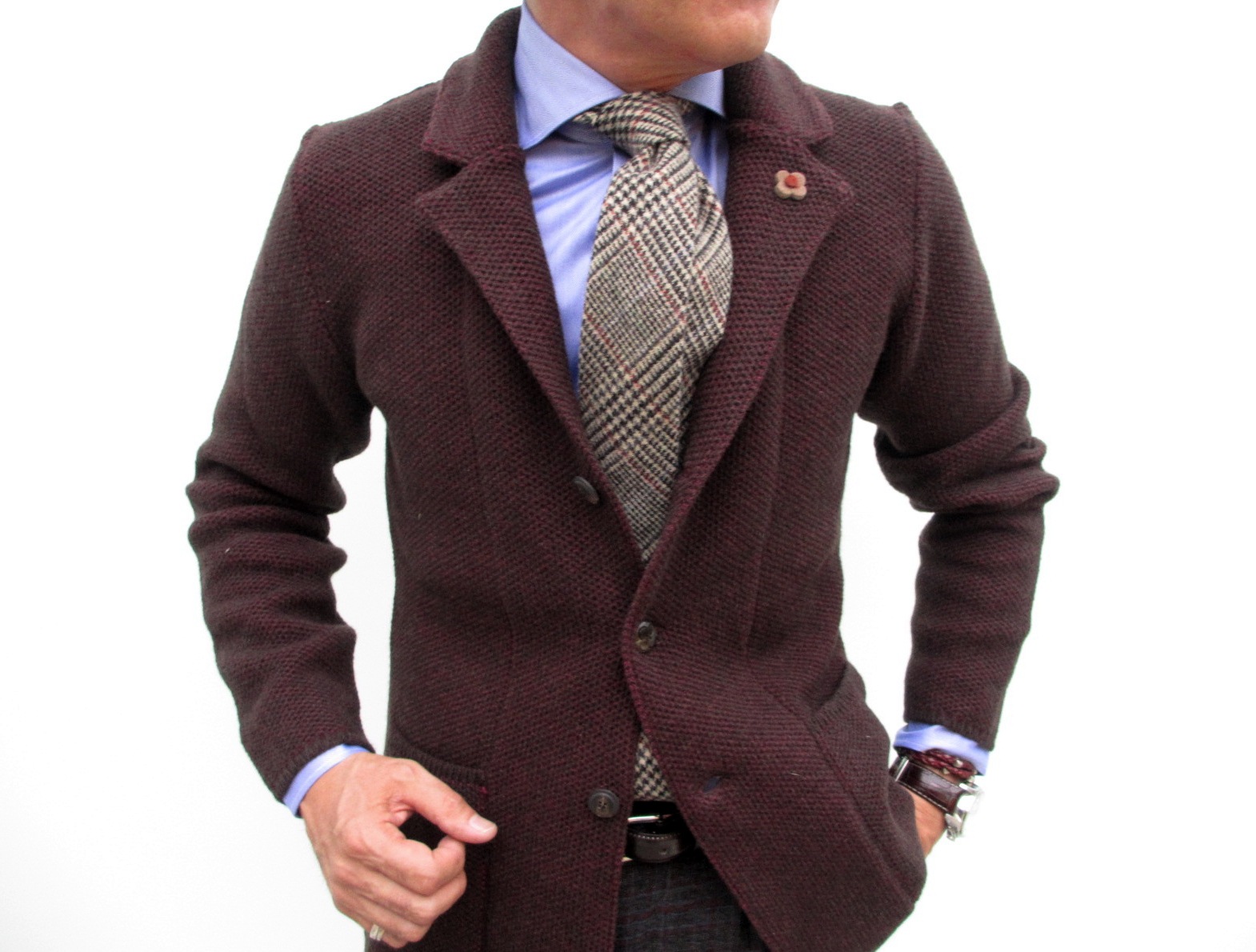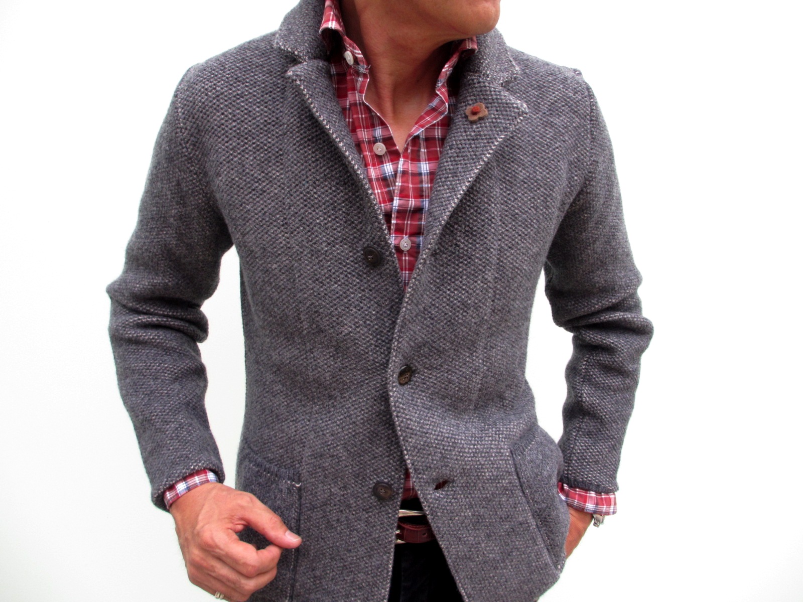 もう1型は、ノッチドラペルのニットジャケット。よりテーラードジャケットに近い形ですが、堅苦しさはありません。