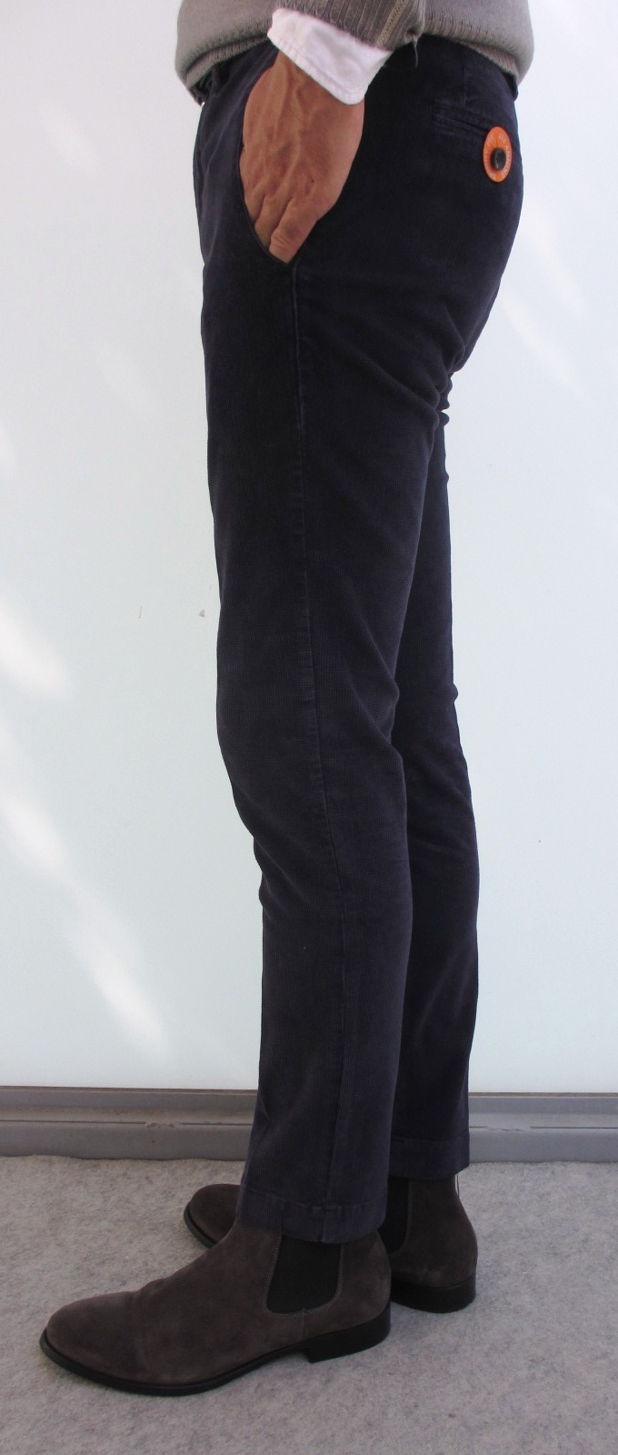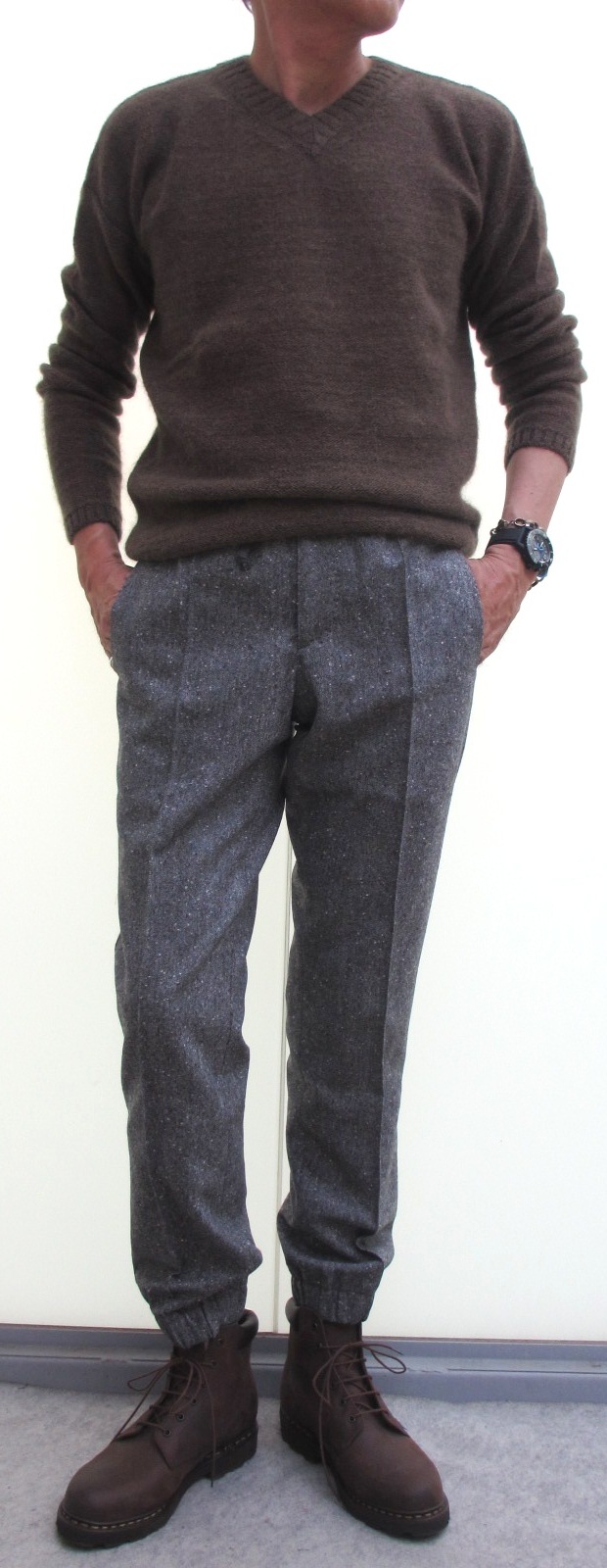 モデルは身長175㎝、体重63K、胸囲91㎝でサイズ44を穿いております。コーディネートで合わせたニットはSCAGLIONE(未公開)、靴はParabootです。