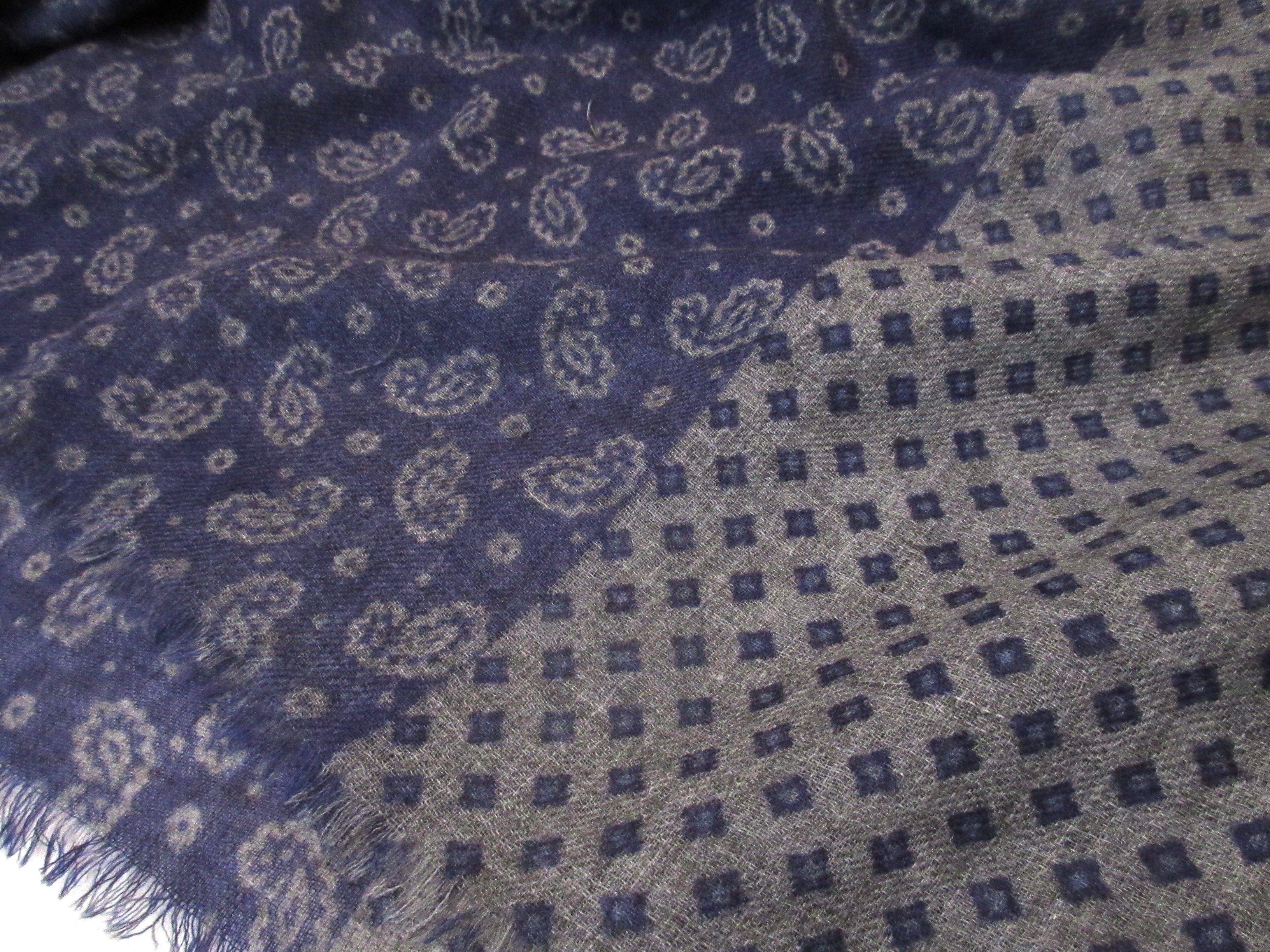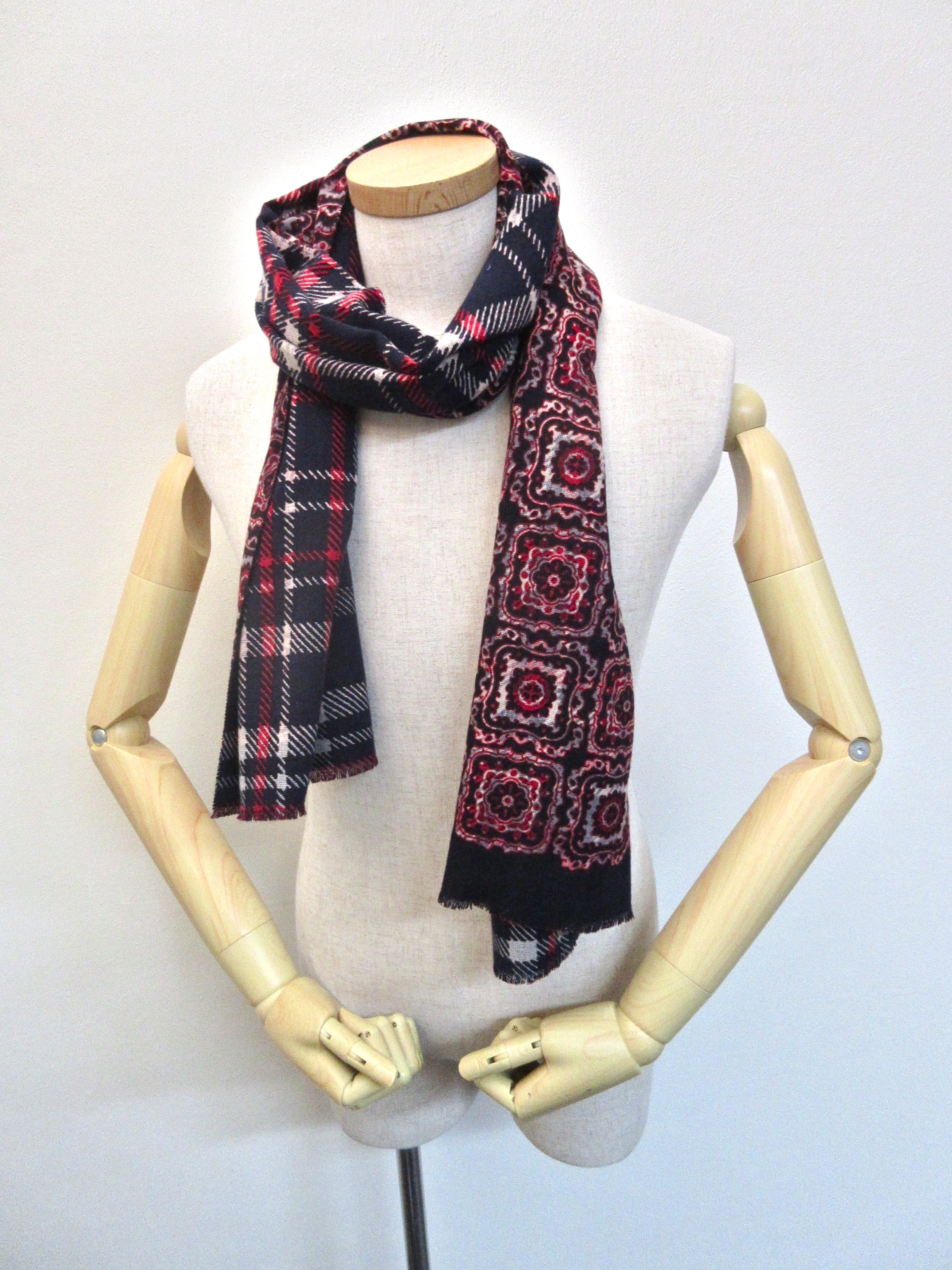 今季も、様々なデザインを揃えておりますが、まずはこちら。ペイズリー柄と、ネクタイによくあるような小紋柄を切り替えたストール。最近、様々なブランドでも提案しているインドウールを使用し、軽くて乾いたような、シャリッとした肌触りが特徴。巻いた時に、ボリュームがでないのも嬉しいです。