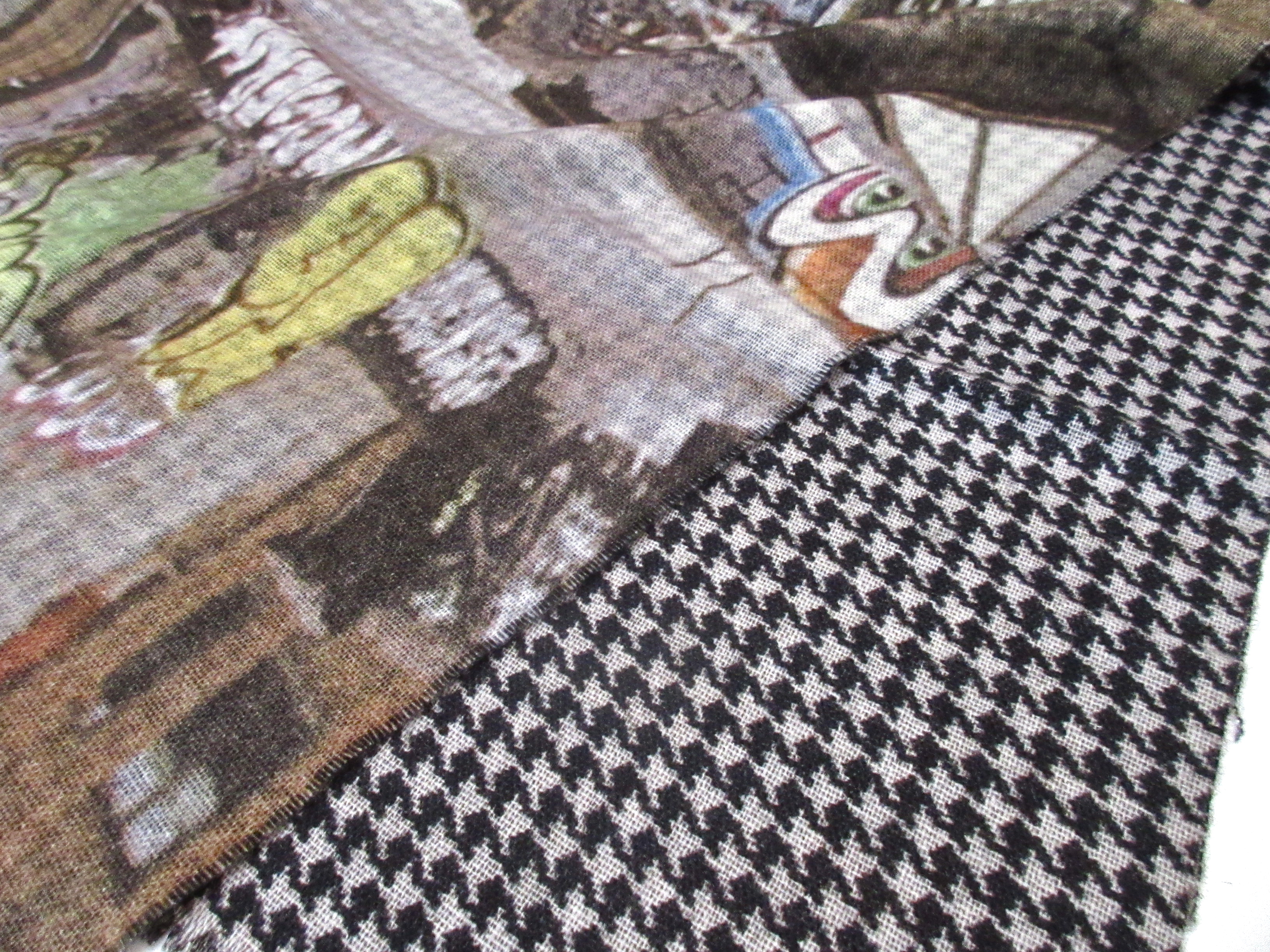 片面はクラシックな千鳥格子柄で、それとは全くの真逆、絶対に交わる事がないウォールアート、いわゆる落書きを組み合わせました。巻いてしまえば、はっきりとしたデザインや柄はわらないので、無造作に巻いた時の色の組み合わせを楽しんで下さい。