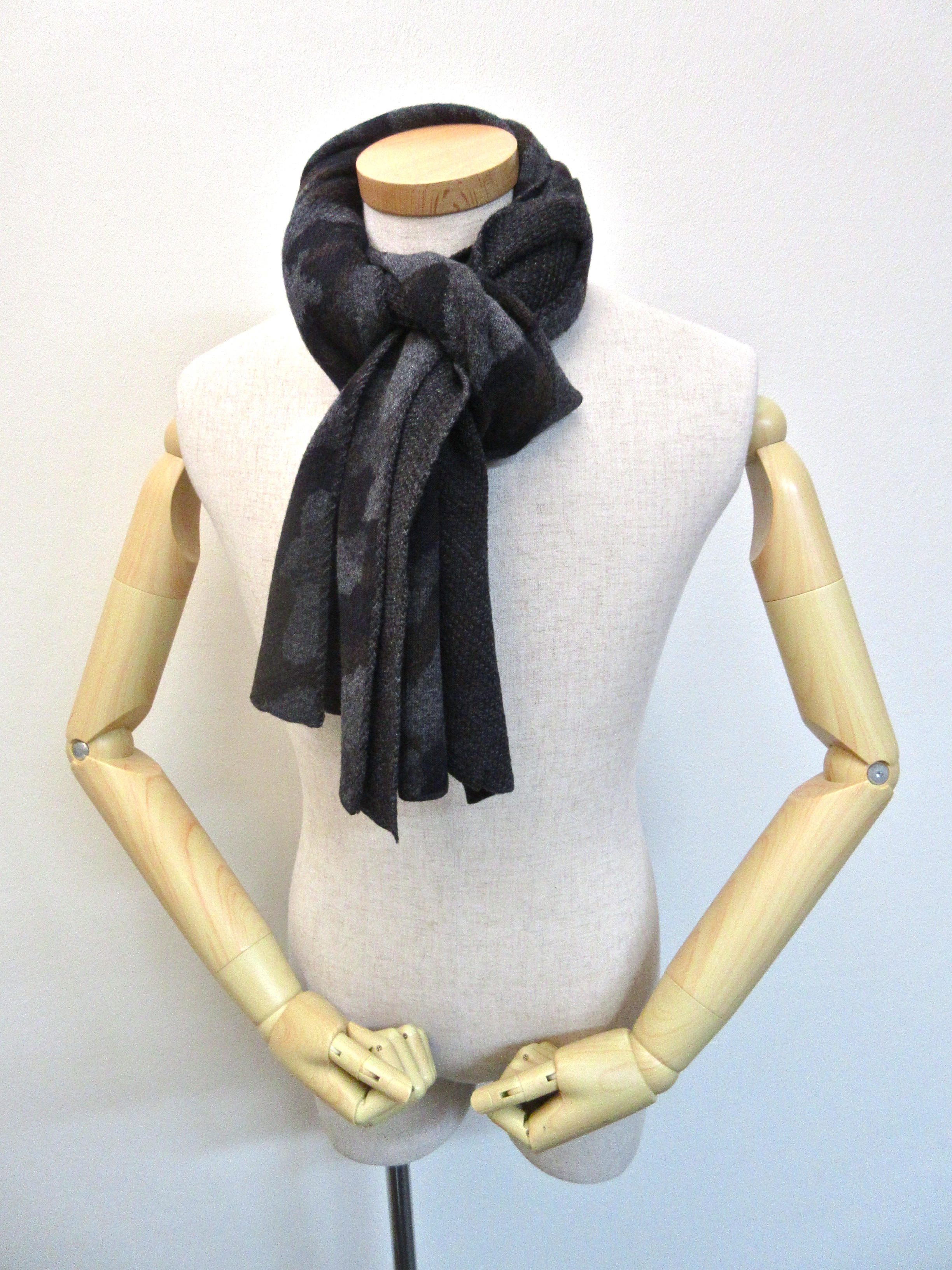切り替えシリーズ最後は、カモフラージュ×無地のニットマフラーです。引き続き人気の高いカモフラージュ柄ですが、今季の気分は、こちらのように、色柄のコントラストが付かないカモフラです。