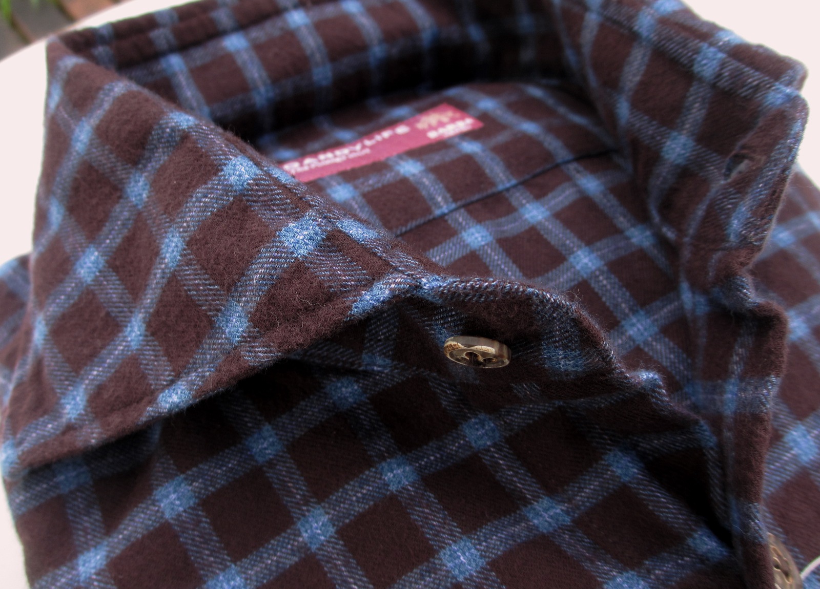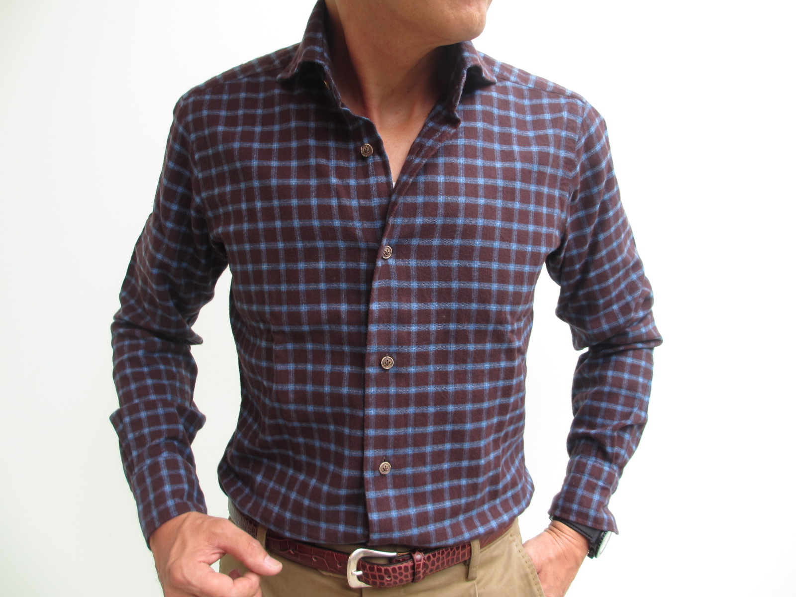 海老茶に近いガーネットベースにブルーのネル地チェックシャツ。ブルーの間にホワイトが入ることで、絶妙な色彩バランスです。