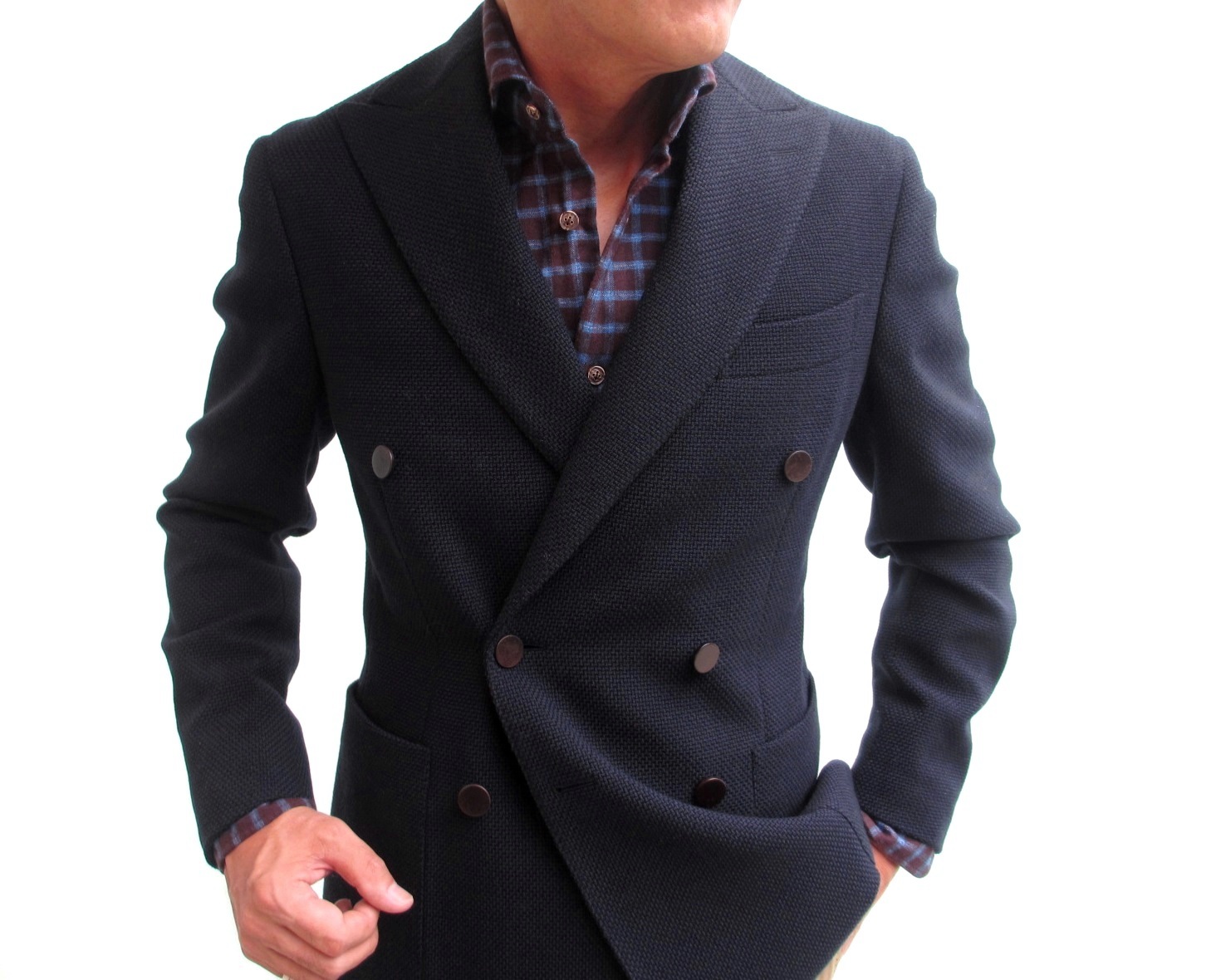 モデルは身長175cm、体重63K、胸囲91㎝で、サイズ44をややタイトに着ております。グレイで合わせたシャツはeleventy、パンツはSIVIGLIA、靴はDOUCAL'S。インディゴで合わせたシャツはeleventy、パンツはSIVIGLIA、靴はDOUCAL'Sです。