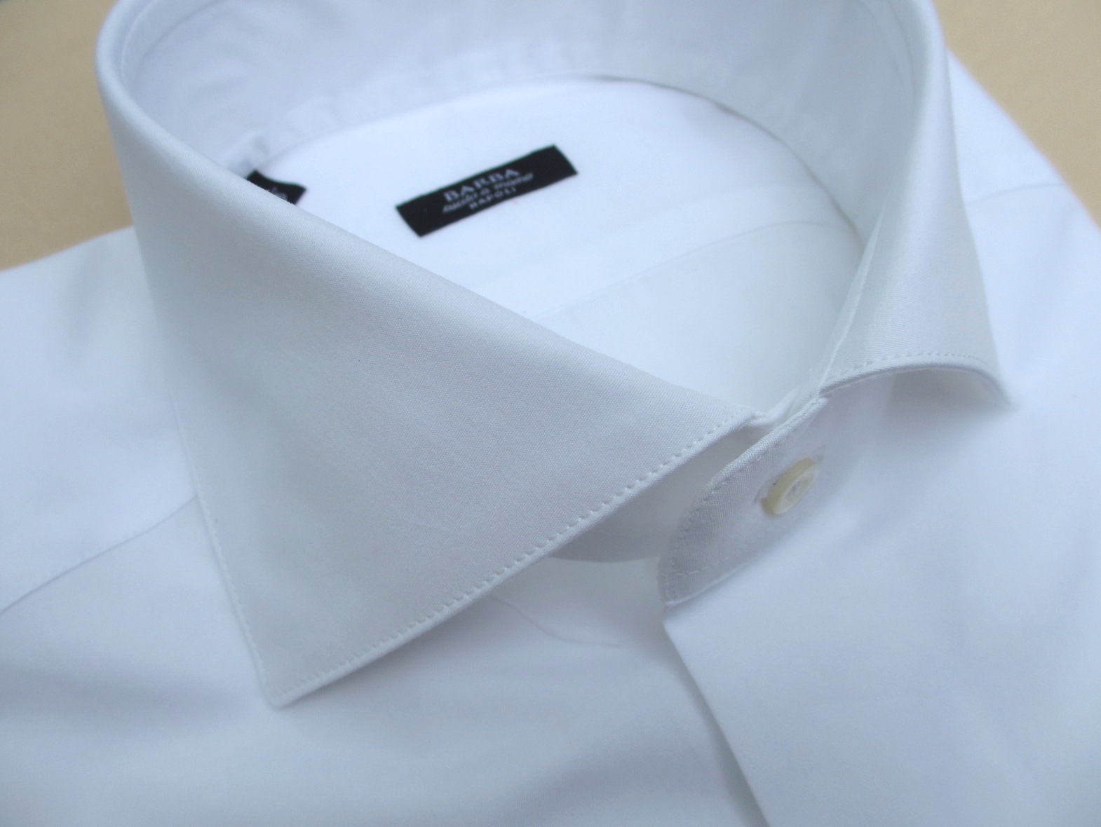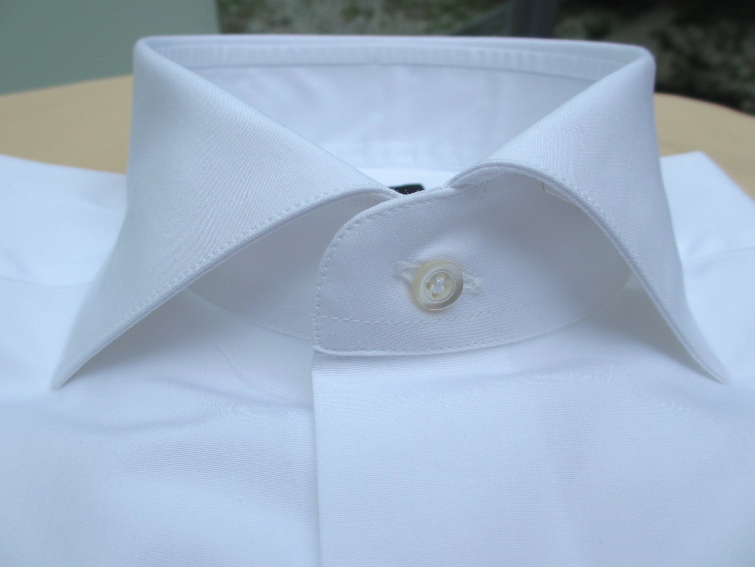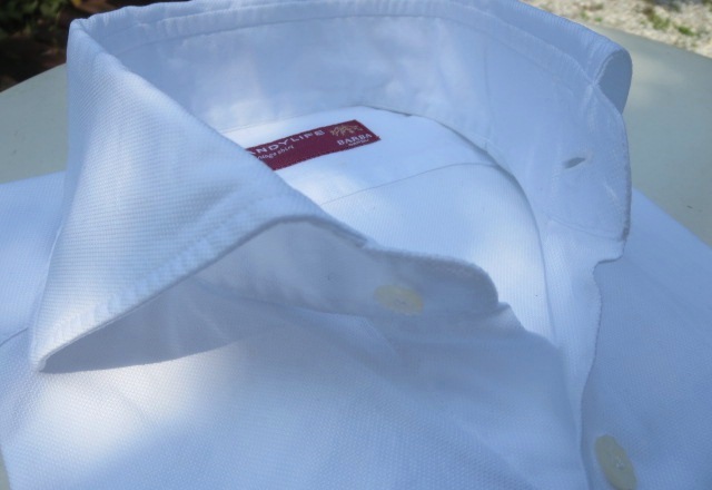 本来なら、レギュラーカラーがふさわしいのでしょうが、やはりワイドスプレッドが好みです。ただカッタウェイほどの開きはなく、エッジステッチを選ぶことで、よりエレガントな仕上がりになりました。