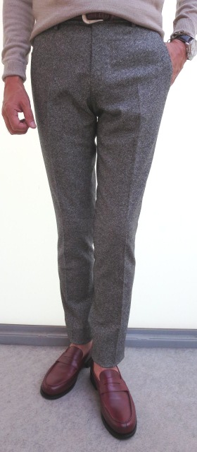 モデルは身長175cm、体重63K、胸囲91㎝で、サイズ44をややタイトに着ております。ブラウンで合わせたシャツ、ストールははeleventy、パンツは SIVIGLIA、靴はParaboot(未公開)。グレイで合わせたシャツ、ストールはeleventy、パンツはSIVIGLIA、靴はparaboot(未公開)です。