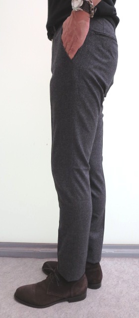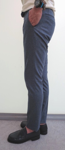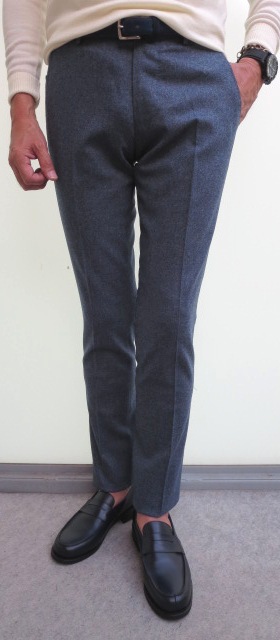 ストレッチの効いた穿きやすいパンツ。股上は、浅からず深すぎずの心地よい位置にあります。裾幅にかけてのテーパード感も美しく、ウール素材をコットンパンツのようにスポーティに見せます。ジャケットにブルゾン、そしてニットに合う、やりすぎてない大人のパンツと言えるでしょう。